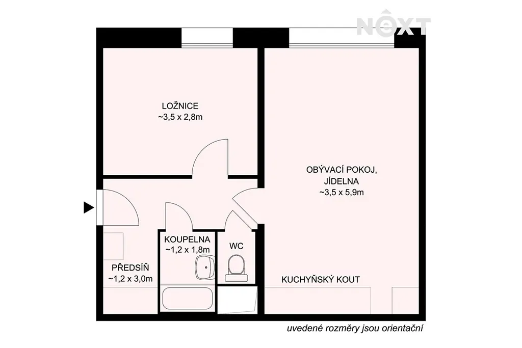 Dispozice bytu zahrnuje předsíň, samostatnou ložnici, obývací pokoj s kuchyňským koutem, koupelnu se sprchovým koutem a samostatnou toaletu. K bytu náleží také sklepní kóje umístěná v přízemí domu. Sklepy mají bezbariérový přístup i z bočního vchodu bytové domu.