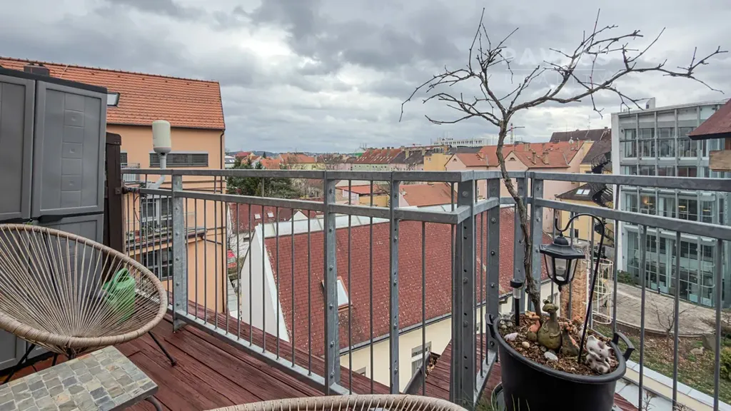 Dominantou celého prostoru je prostorná terasa o výměře 10 m2, která nabízí ojedinělý prostor pro relaxaci v exteriéru přímo v historickém jádru metropole. Byt je promyšleně dispozičně řešen tak, aby maximálně využil svůj potenciál a nabídl budoucímu nájemci plnohodnotný komfort.