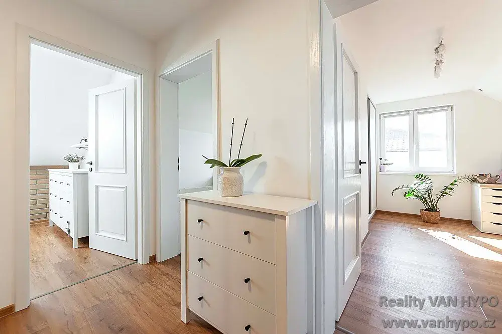 Citlivě zařízený světlý interiér s praktickou dispozicí nabízí v prvním nadzemním podlaží vstupní chodbu a halu, koupelnu se sprchovým koutem, toaletou a místem pro pračku/sušičku, sklad pod schody, pokoj/pracovnu a především otevřený obytný prostor s krbem, který je propojený s kompletně vybavenou kuchyní a jídelním koutem. Z obytného prostoru je přes francouzské okno vstup na zastřešenou terasu a dál do udržované zahrady. Ve druhém nadzemní podlaží, kam vedou stylové dřevěné schody jsou k dispozici 3 ložnice, koupelna s vanou a toaletou a dále skladový prostor na půdě. Praktická je i garáž s průchodem do zahrady, která může samozřejmě sloužit i jako sklad a dílna.