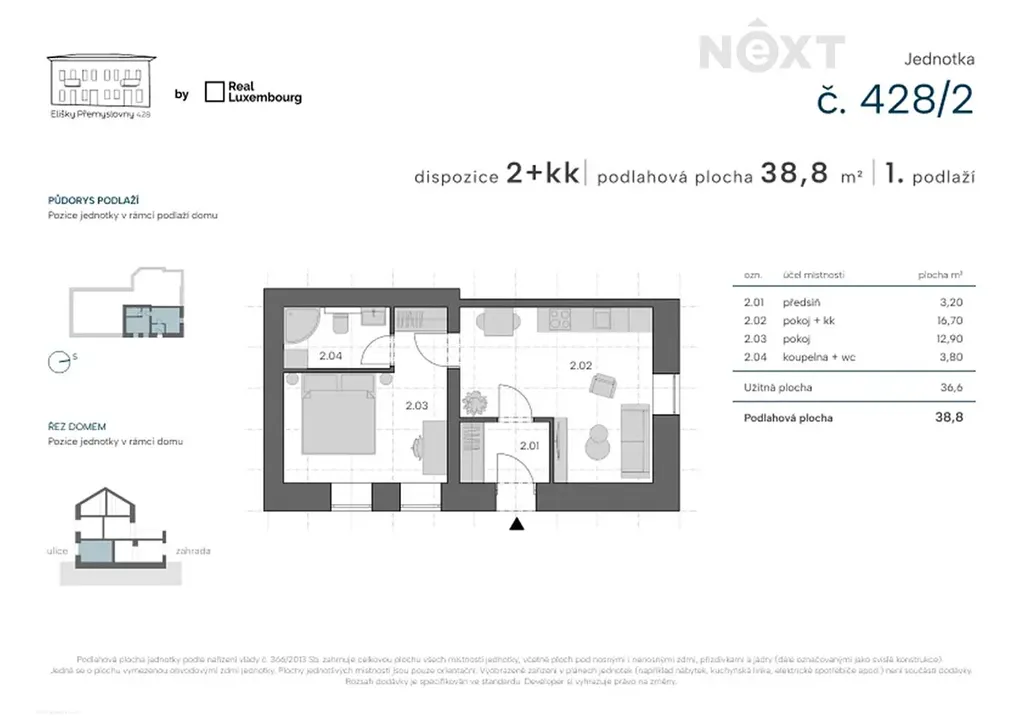 Hledáte klidné bydlení, kde se historie snoubí s moderní architekturou v dosahu všeho potřebného? Nabízíme k prodeji prostornou a dobře dispozičně řešenou jednotku 2+kk o celkové ploše 39 m² situovanou v 1. nadzemním podlaží kompletně zrekonstruovaného domu v klidné rezidenční lokalitě. Dispozičně jednotka nabízí obývací pokoj, kuchyň s přípravou pro kuchyňský kout, koupelnu se sprchovým koutem a toaletou.