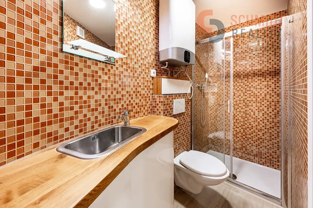 Dispozice: hlavní místnost s přímým vstupem z ulice a koupelna se sprchovým koutem.