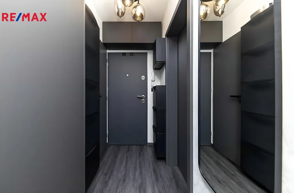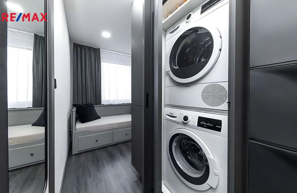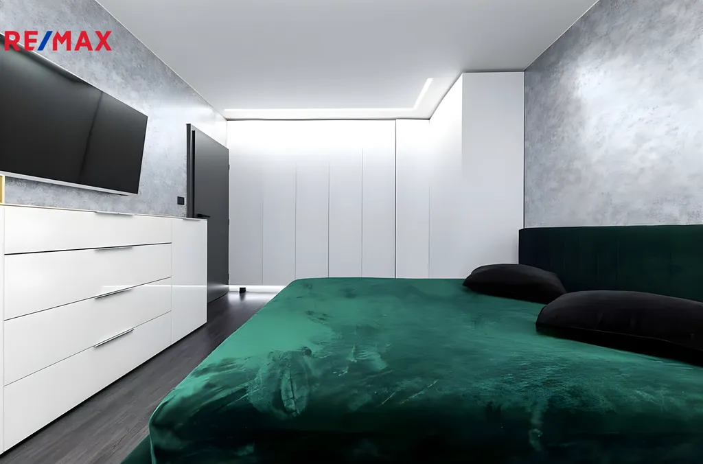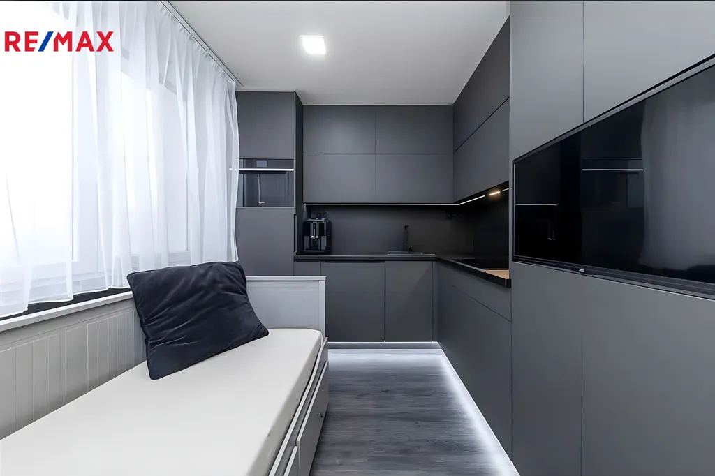 Byt prošel kompletní rekonstrukcí a pronajímá se včetně veškerého vybavení. K dispozici je postel, vestavěné skříně s dostatkem úložného prostoru, pračka i sušička, takže se můžete ihned nastěhovat bez dalších investic. Interiér působí velmi čistě a moderně, přičemž tmavé prvky dodávají prostoru styl a originalitu.