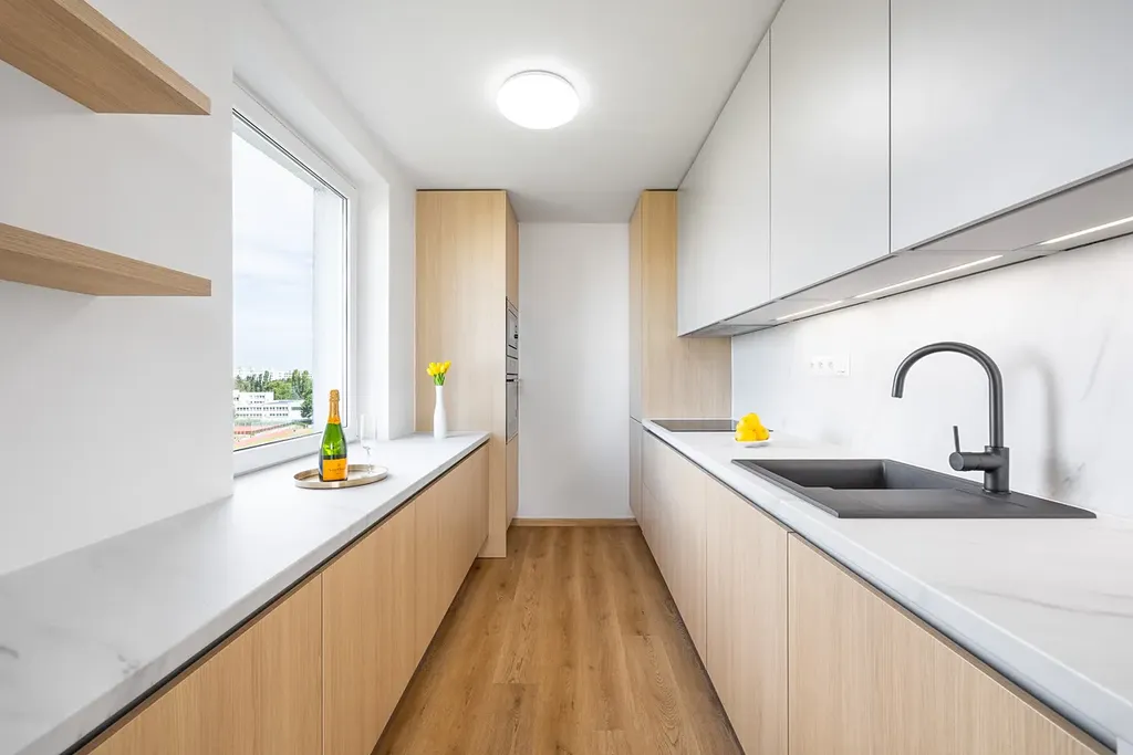 - nová kuchyňská linka vyrobena na míru se spotřebiči (značková elektrická trouba, myčka, indukční deska, digestoř, osvětlení, dřez)