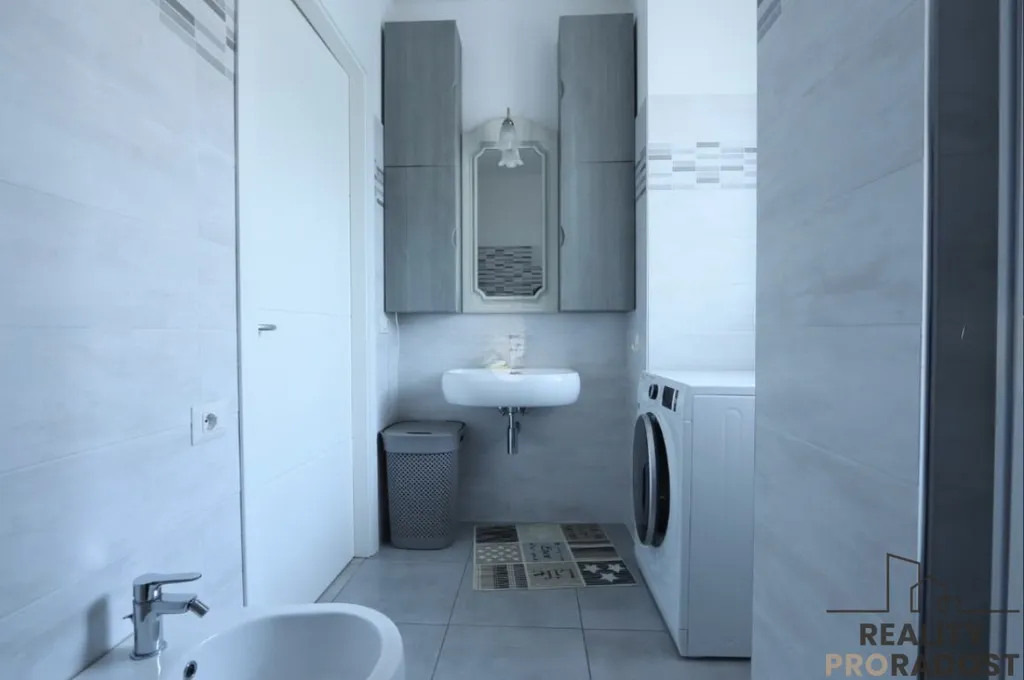 Noční část tvoří útulná ložnice s manželskou postelí a koupelna s oknem, která zajišťuje dostatek denního světla i přirozené větrání.