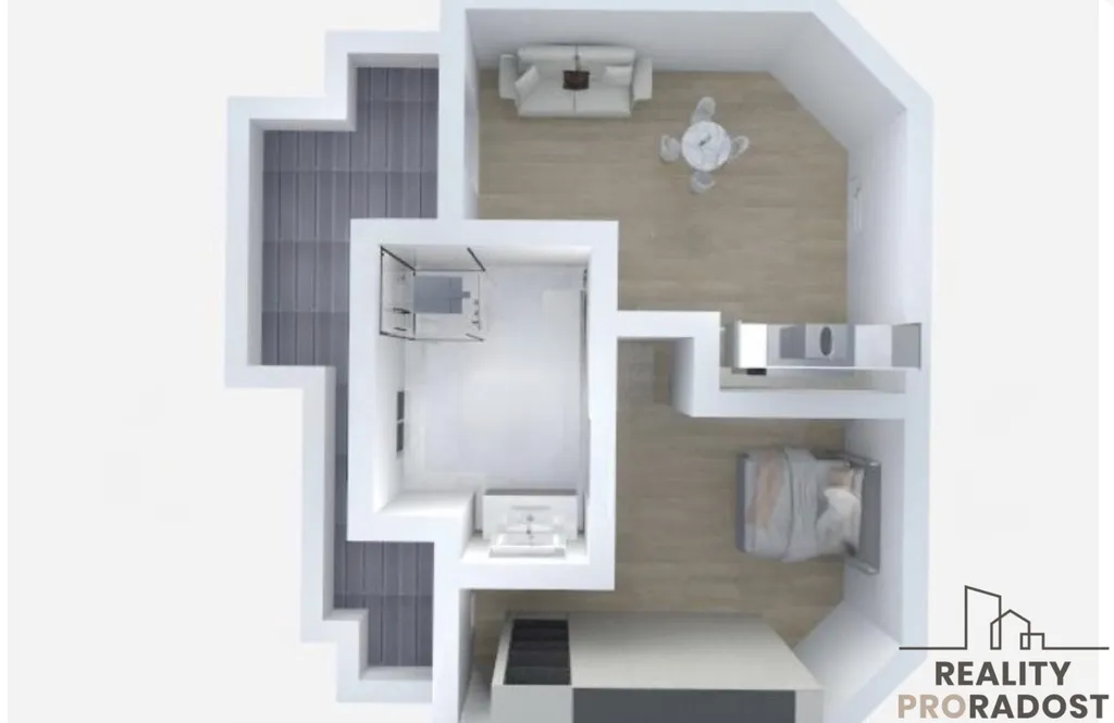 Apartmán nabízí světlý obývací pokoj s kuchyňským koutem, který plynule navazuje na prostornou terasu – ideální místo pro relaxaci a trávení příjemných chvil venku.