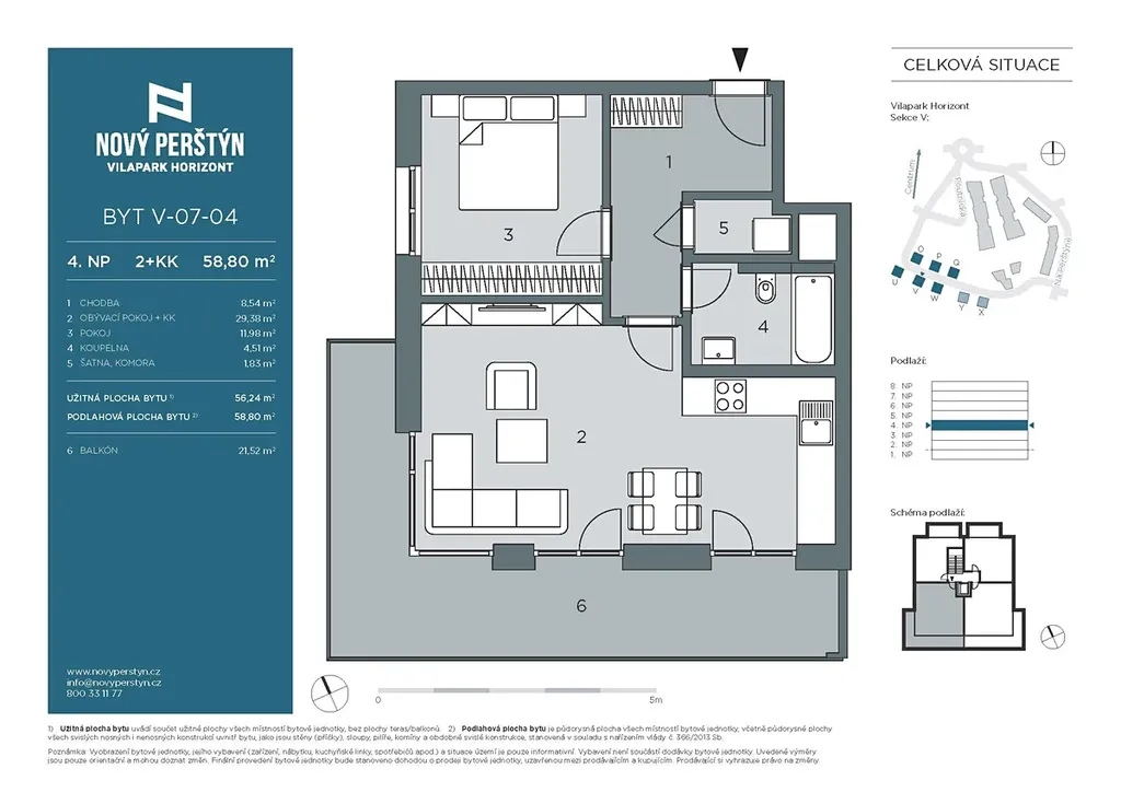 Nový byt V-07-04 o dispozici 2+kk (56,24 m2) s balkónem (21,52 m2) se nachází ve 4. nadzemním podlaží budovy „V“ projektu Nový Perštýn, Vilapark Horizont.