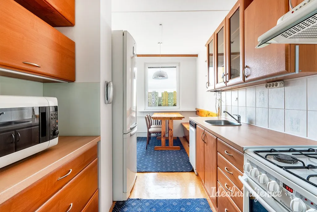 Dispozičně byt nabízí prostornou předsíň i šatnu, a plně vybavenou koupelnu včetně pračky. Hlavní dominantou je obývací pokoj, který je již plně vybaven, jak vidíte na fotkách. Kuchyň je zde samostatnou místností a obsahuje všechny důležité spotřebiče včetně myčky. Obývací pokoj je spojen s prostorným balkonem, který nabízí nádherný výhled třeba i k večernímu posezení. Součástí bytu jsou také dva velké pokoje, které již poskytují úložné prostory.