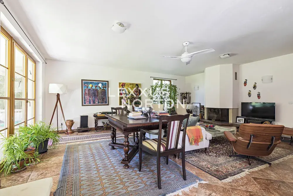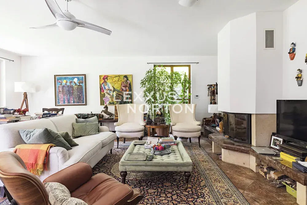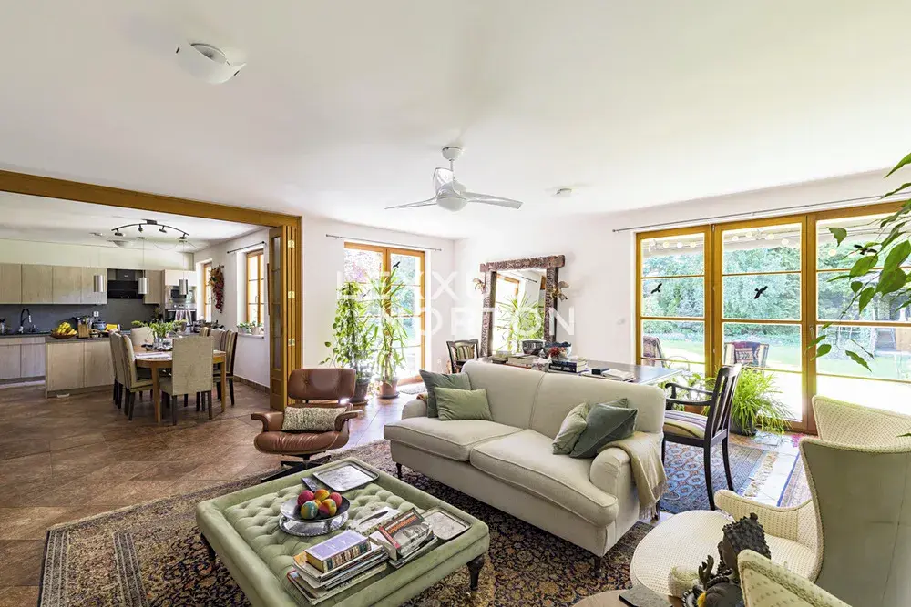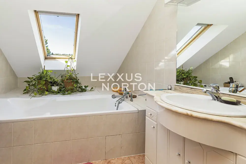 Tento nezařízený dům k pronájmu je dvoupodlažní, disponuje 4 až 5 ložnicemi (celkem 6+1), 3 koupelnami, garáží pro dva vozy a velkou zahradou s terasou. V přízemí se nachází vstupní hala, velký obývací pokoj (42 m2) s krbem a vstupem na terasu a zahradu, jídelna a plně vybavená kuchyň, spíž, ložnice, koupelna, prádelna, šatna a samostatná toaleta. V 1. patře (v podkroví) se nachází 3 ložnice se šatnami, obytná místnost s malou kuchyňkou a barem (rodinná místnost či pokoj pro hosty), 2 koupelny a samostatná toaleta.