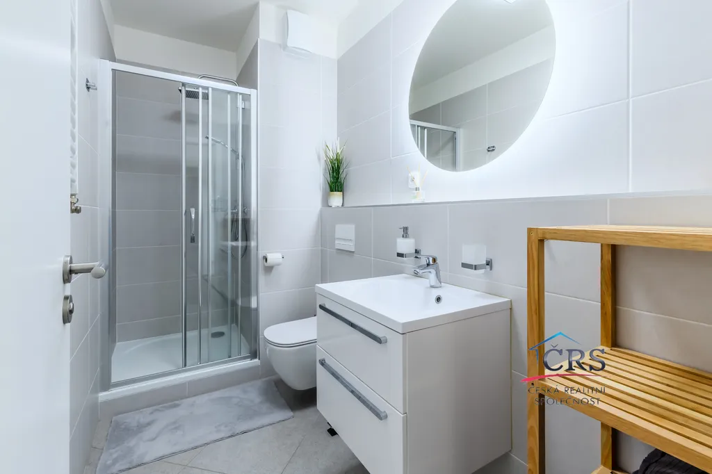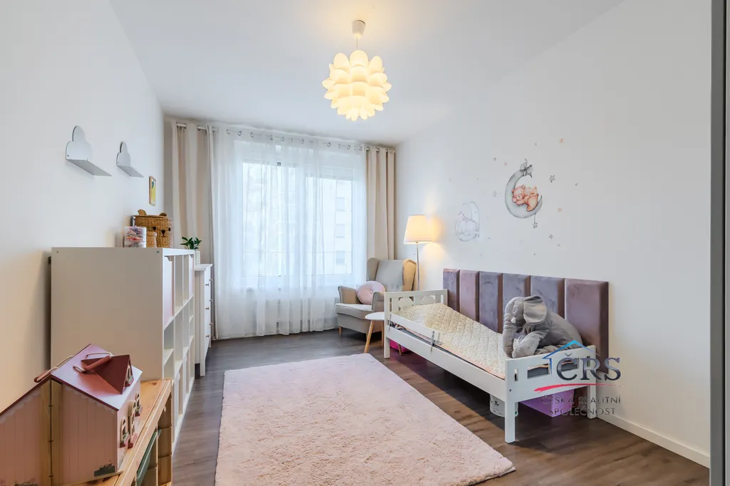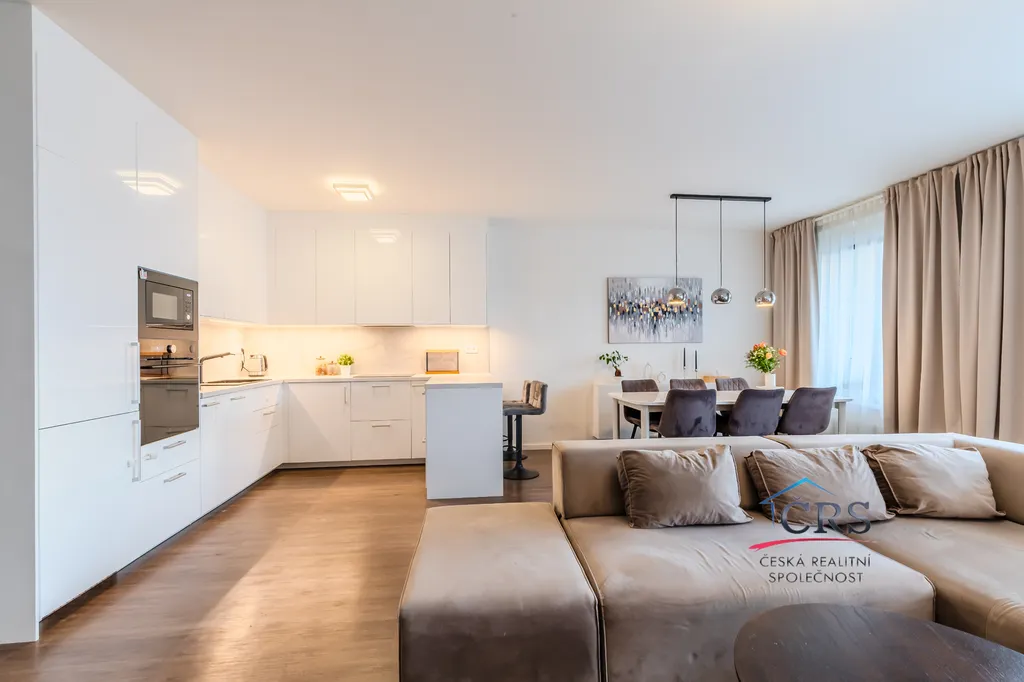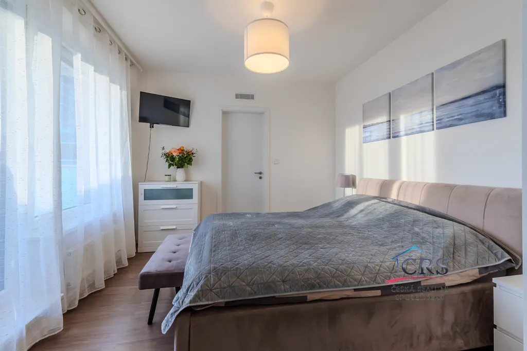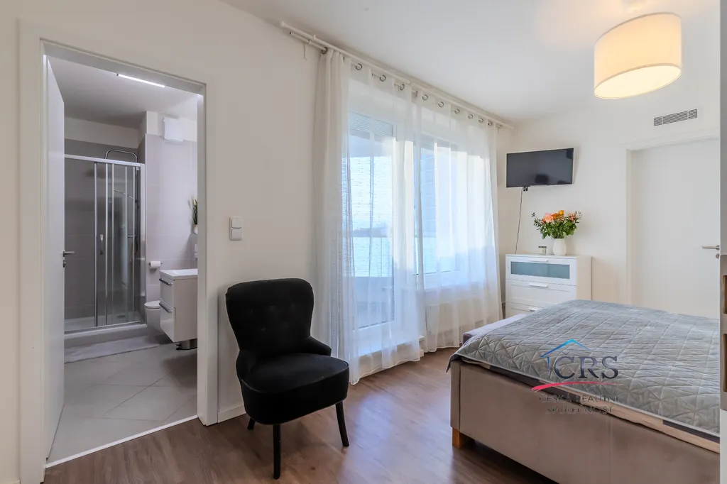 Dispozice bytu nabízí praktické a komfortní bydlení – všechny pokoje jsou neprůchozí, což zajišťuje maximální soukromí, dvě koupelny. Prostorný obývací pokoj s kuchyňským koutem o výměře 43,5 m2 ( kuch. linka s vestavěnými spotřebiči) . Jedna ložnice má svoji koupelnu se sprchovým koutem a WC dohromady, dále prostornou šatnu a balkón. V druhé koupelně je vana a WC. Na podlaze dlažba a vinyl, na stěnách štuky. Byt je vybaven klimatizací v obývacím pokoji pro pohodlí v letních měsících a zabezpečovacím systémem Jablotron.