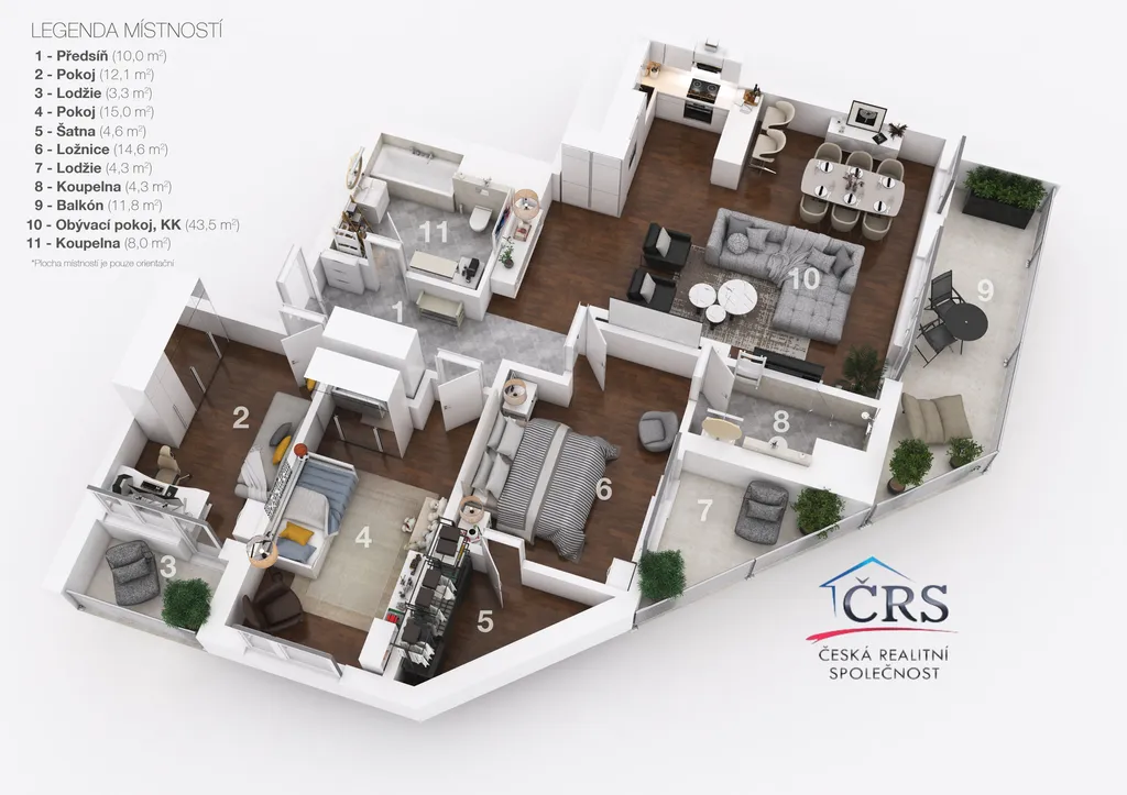Byt má podlahovou plochu 117,2 m2 a disponuje třemi balkóny o výměře 19 m2, které poskytují dostatek prostoru pro relaxaci i posezení s rodinou či přáteli.