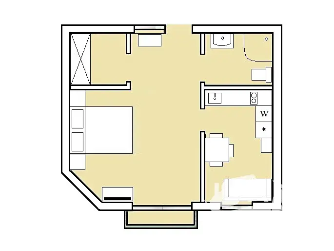 dispozice: vstupní chodba, obývací pokoj s kuchyňským koutem a jídelnou, ložnice, koupelna s toaletou, balkon