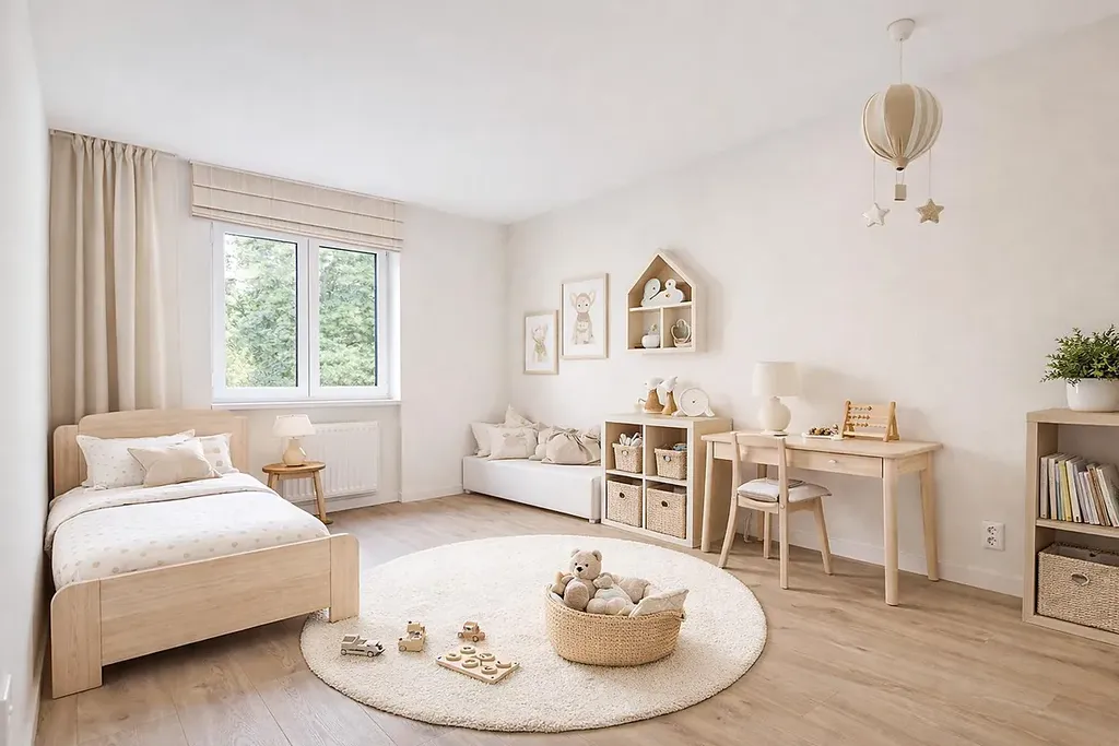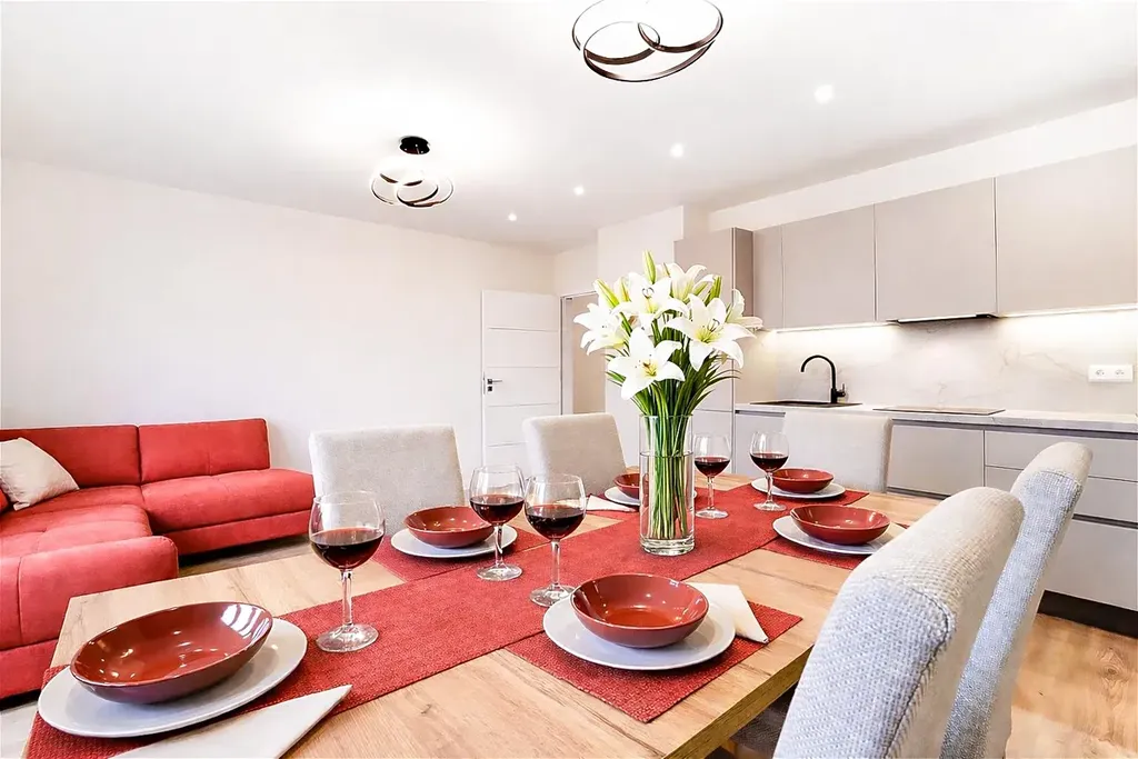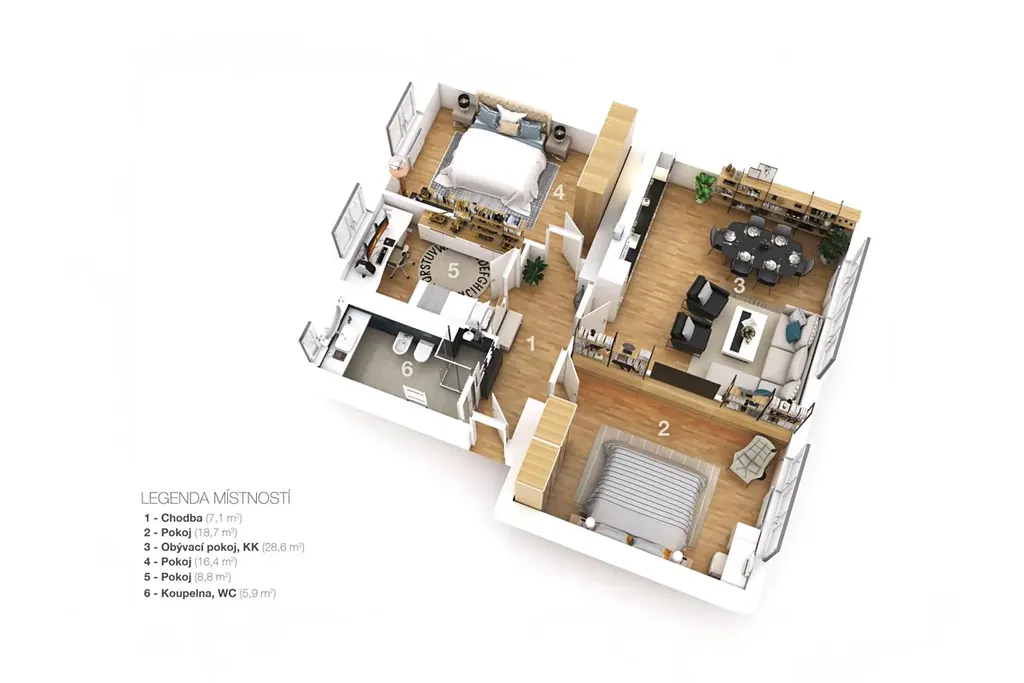 Dispozice: vzdušný obývací pokoj s kuchyňským koutem, velká ložnice, prostorný dětský pokoj, praktická pracovna, předsíň, koupelna s oknem, sprchovým koutem, WC, bidetem a podlahovým vytápěním.