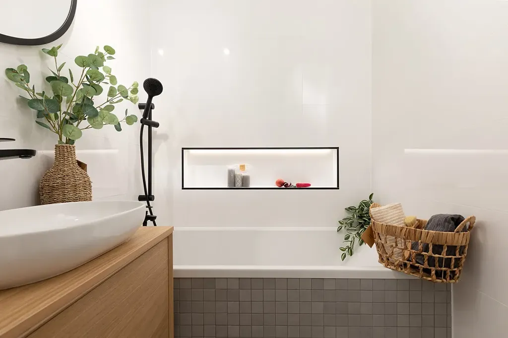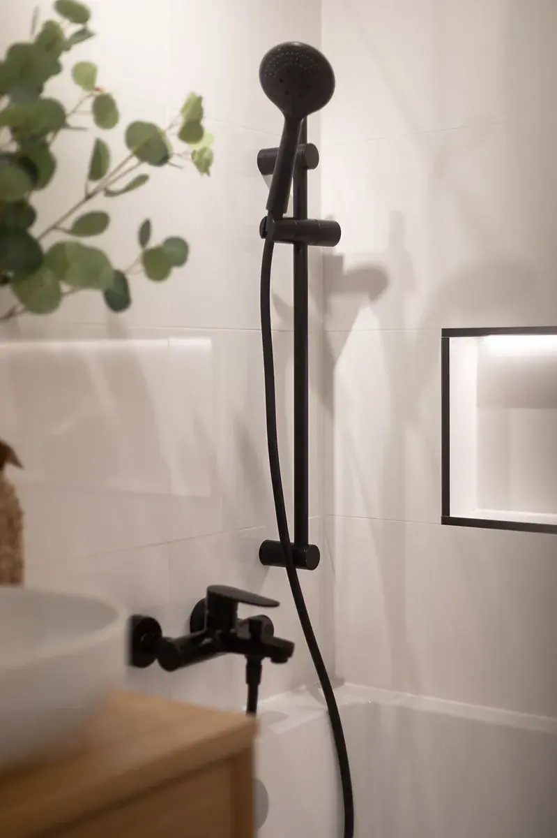 V koupelně jsou obklady a dlažba, které k sobě ladí, nová sanita.