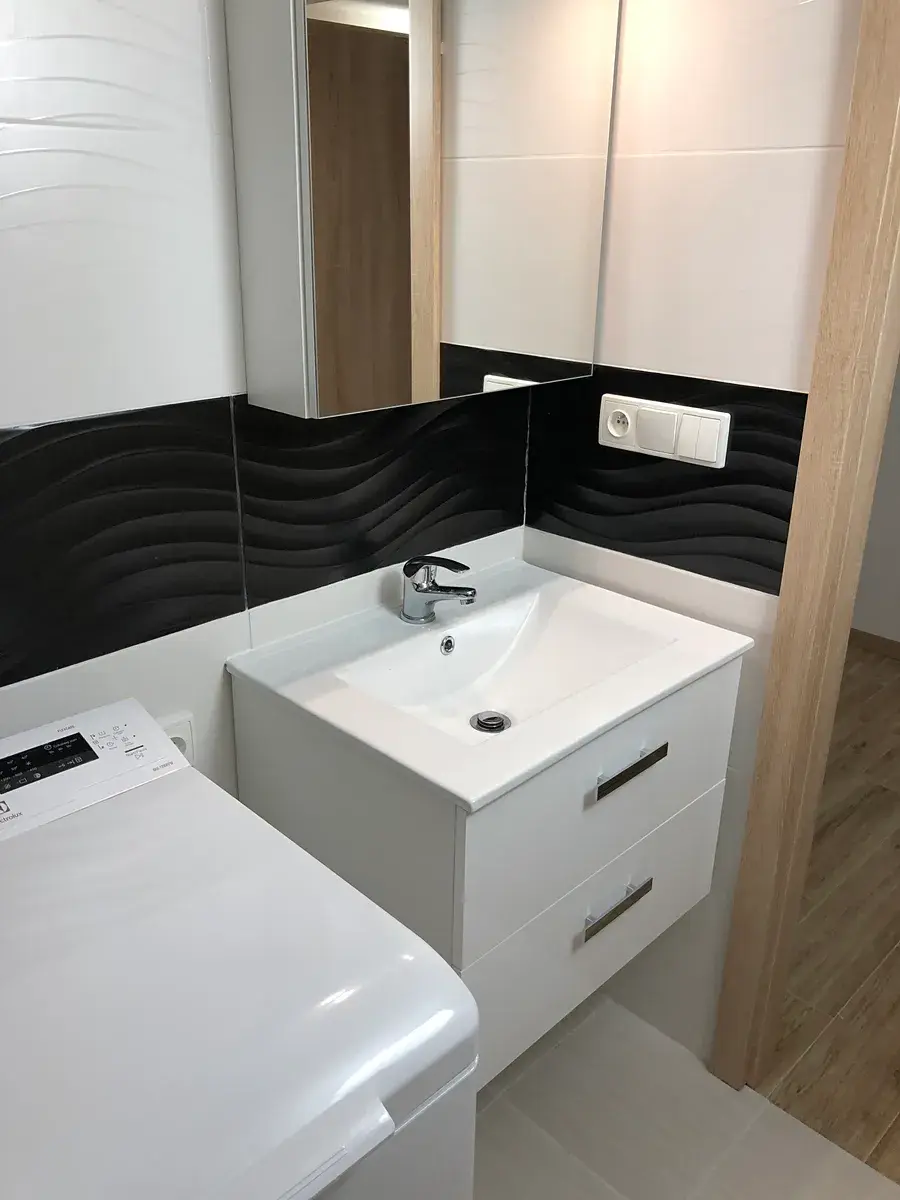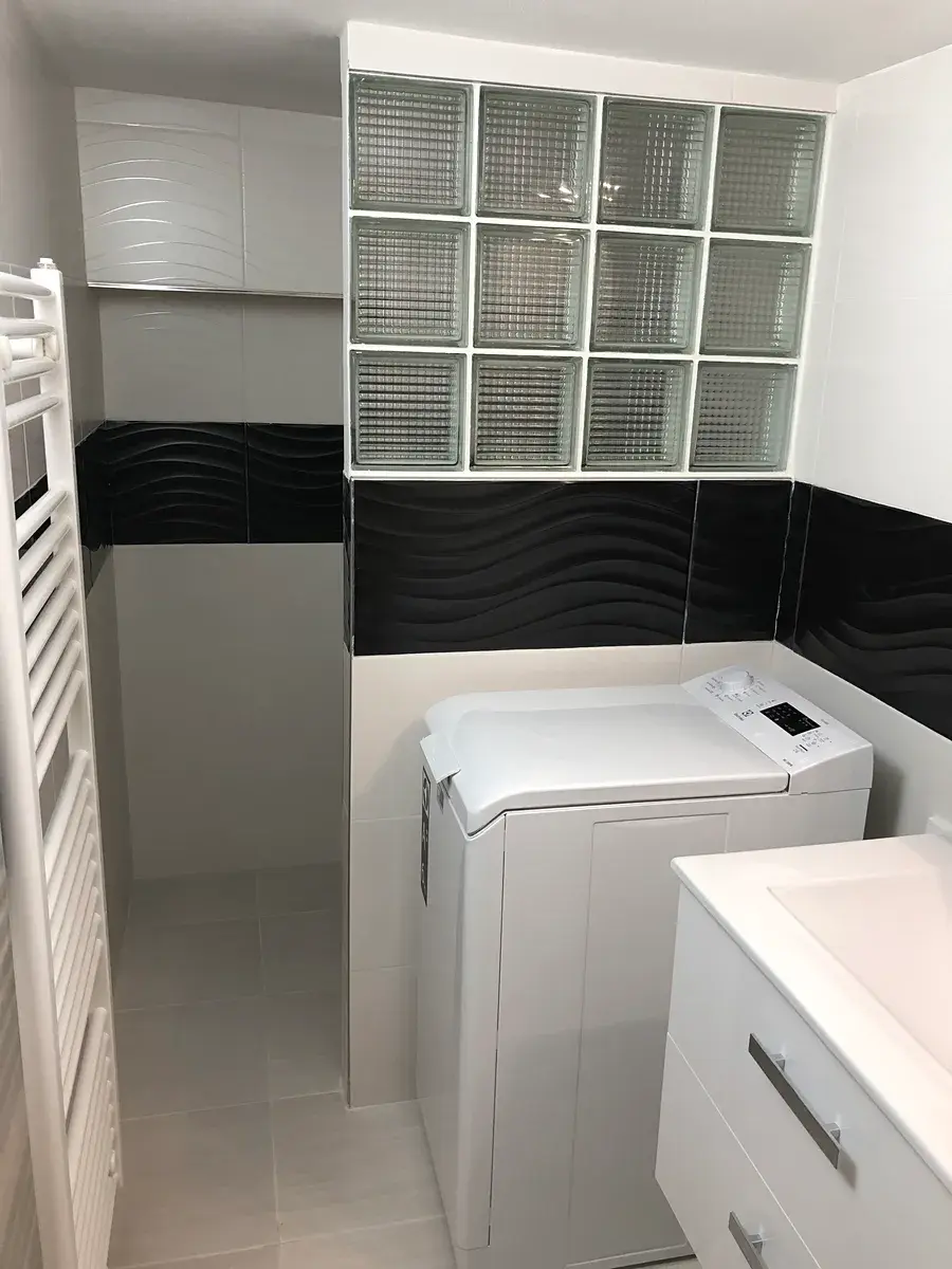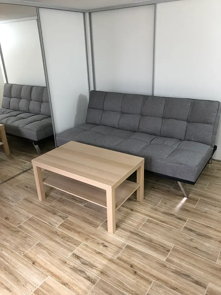 Dispozice a vybavení bytu: Kuchyňský kout se spotřebiči (velká lednice s mrazákem, varná deska, mikrovlnná trouba), dále pohovka, stůl + 2 židle, skříň. V ložnici manželská postel s kvalitní matrací, přikrývkami, polštáři a povlečením. Koupelna se sprchovým koutem, pračkou a wc.