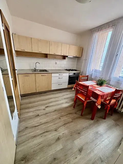 Byt je zařízený a vybavený včetně pračky, lednice, rozkládací sedací soupravy, jídelní stůl se židlemi, praktická šatna se skříněmi.