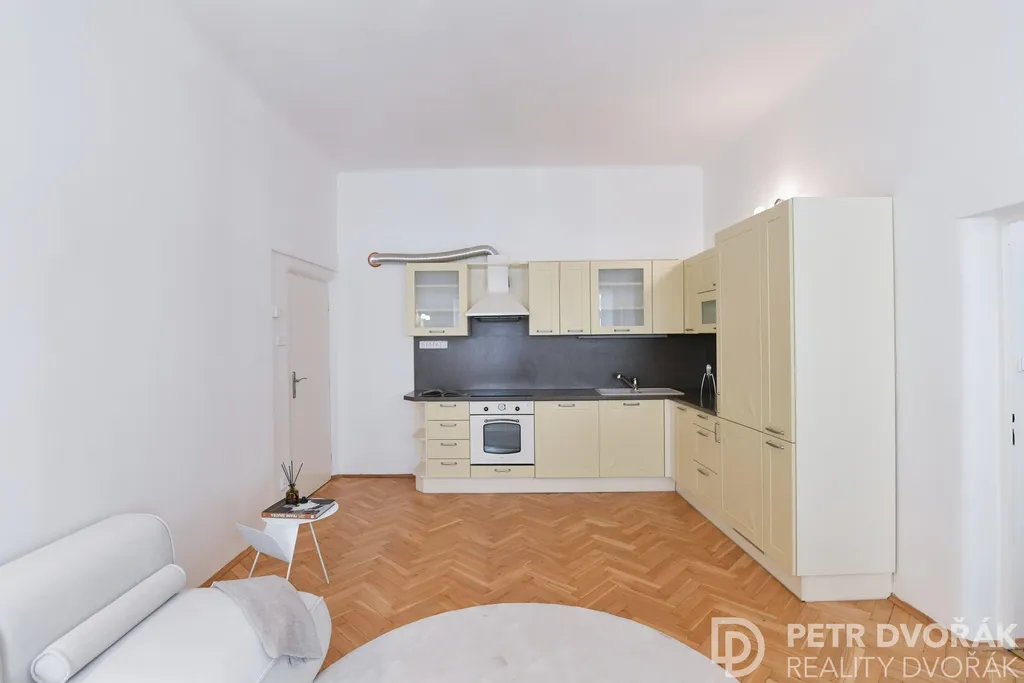 Pak obývací pokoj s kuchyňským koutem. Dvě kastlová okna s hlubokými špaletami otevřená do Haštalské ulice – ráno tudy nikdo nespěchá, turisté ji nenajdou, zní tu kroky. Kuchyň je vyrobena na míru: lednice s mrazákem, myčka, trouba, varná deska. Na podlaze původní parkety, nově renovované v roce 2024.