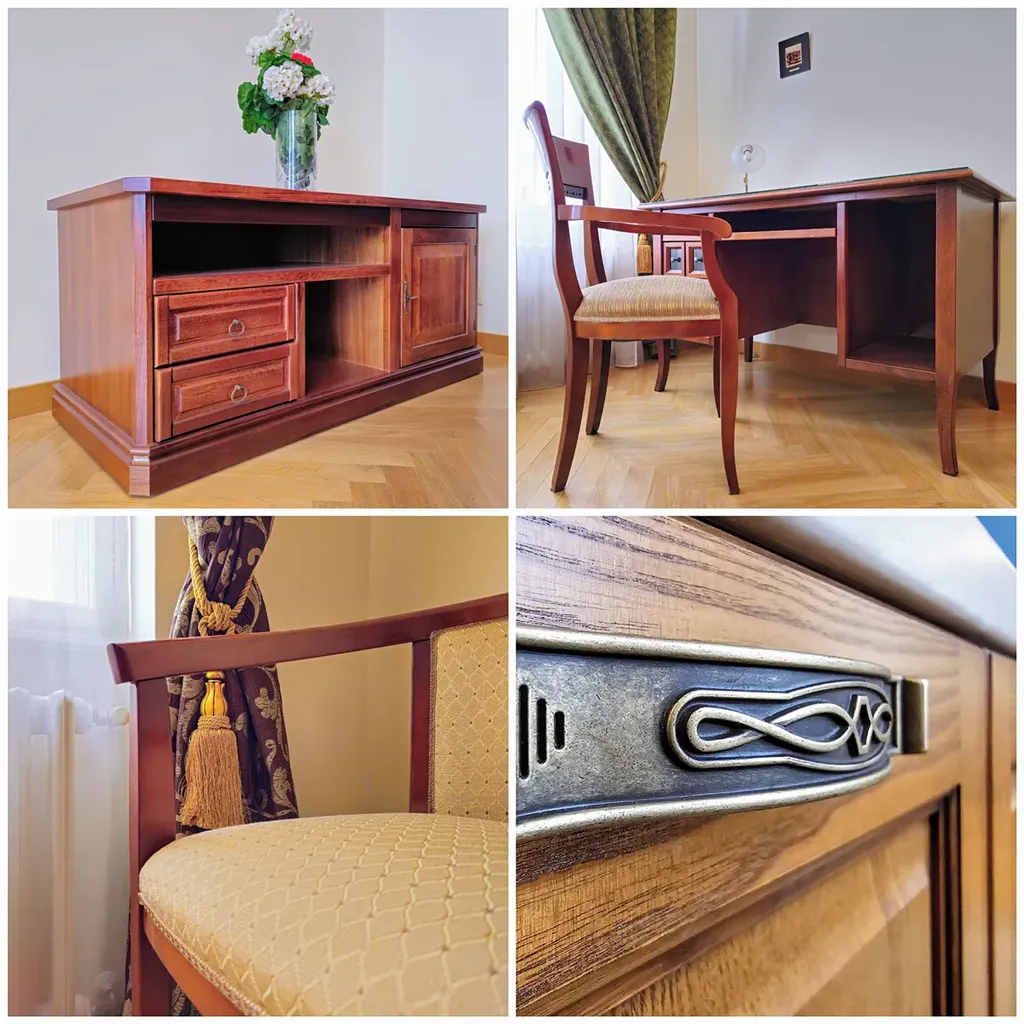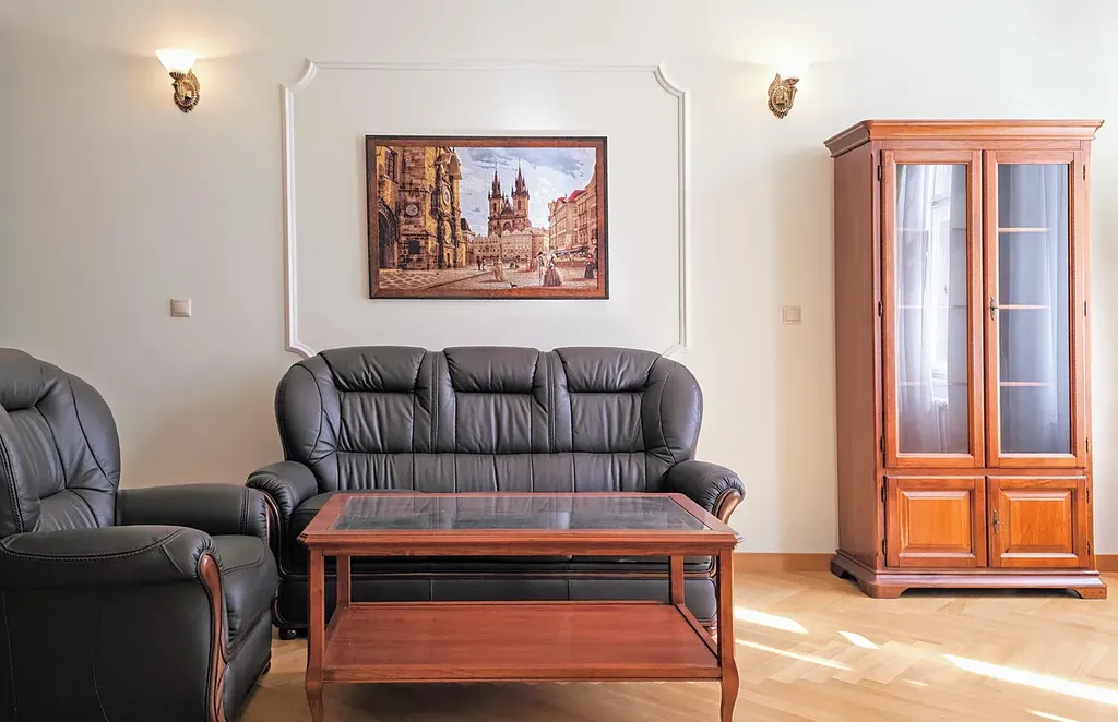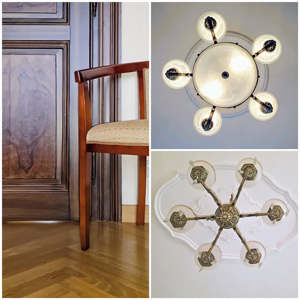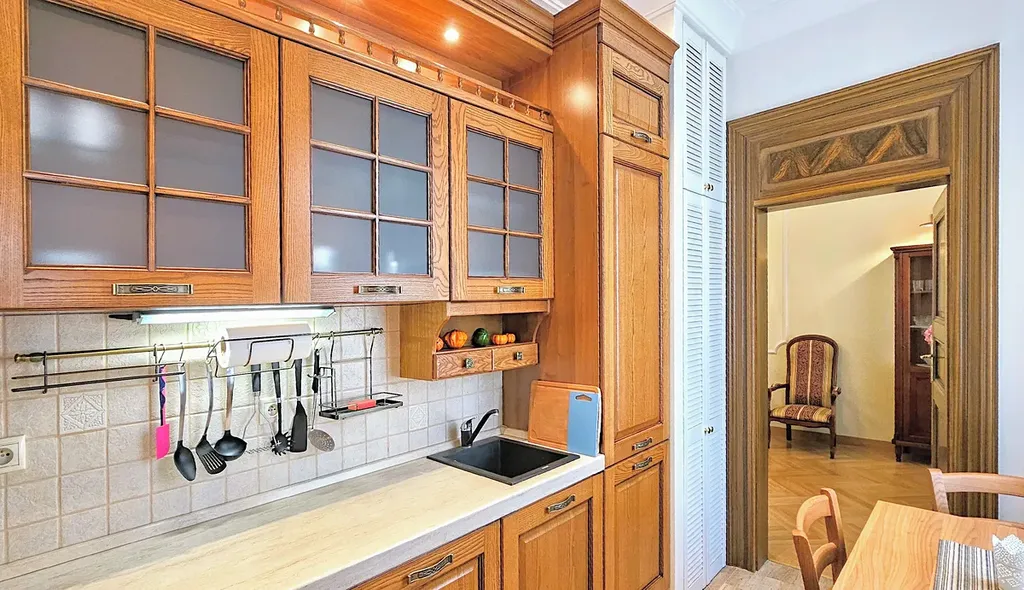 Interiér bytu je důkazem sofistikovaného architektonického přístupu, kde moderní design harmonicky splývá s autentickými prvkami, včetně precizně zpracovaných replik špaletových oken, dřevěných parapetů a pečlivě renovovaných dveří. Kompletní rekonstrukce bytu zahrnovala instalaci kvalitních dřevěných parket a keramické dlažby, na míru vyrobenou kuchyň s moderními spotřebiči, integrovanou pračkou a bezpečně umístěným plynovým kotlem.