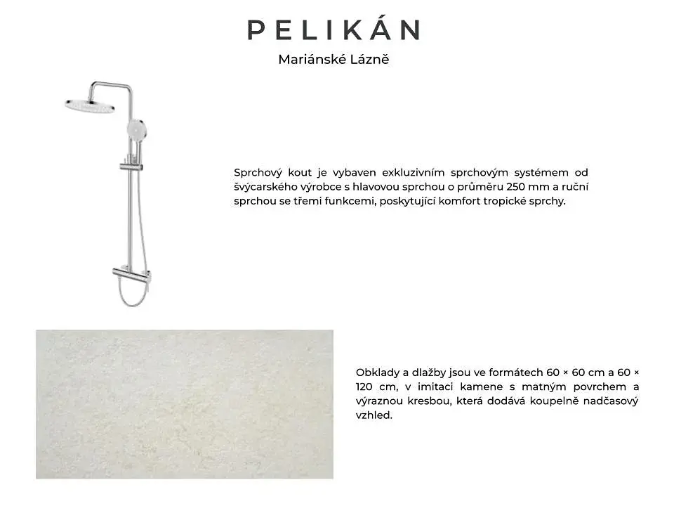 Koupelna je řešena v moderním designu s důrazem na funkčnost a hygienu. Součástí je celokapotované WC s duálním splachováním (3/5 l) a sedátkem Soft Close. Umyvadlová skříňka s umyvadlem nabízí praktický úložný prostor, doplněná o zrcadlovou skříňku s LED osvětlením a zásuvkou 230 V. Sprchový kout je vybaven exkluzivním sprchovým systémem od švýcarského výrobce s hlavovou sprchou o průměru 250 mm a ruční sprchou se třemi funkcemi, poskytující komfort tropické sprchy. Obklady a dlažby jsou ve formátech 60 × 60 cm a 60 × 120 cm, v imitaci kamene s matným povrchem a výraznou kresbou, která dodává koupelně nadčasový vzhled. V koupelnách je instalováno teplovodní vytápění, které zajišťuje příjemný tepelný komfort a rovnoměrné sálavé teplo.