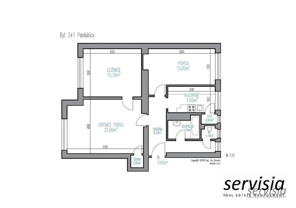Dispozice bytu je velmi funkční a přehledná. Vstupní chodba zajišťuje samostatné vstupy do koupelny a na WC. Vlevo se pak vstupuje do obývacího pokoje s malou šatnou a dále pak do ložnice. Z chodby je pak po pravé straně vstup do kuchyně, kde je navíc i praktická spíž. Rovně z chodby je pak situován další pokoj. Stěna mezi tímto pokojem a kuchyní není nosná, bylo by tedy možné zvětšit plochu kuchyně.