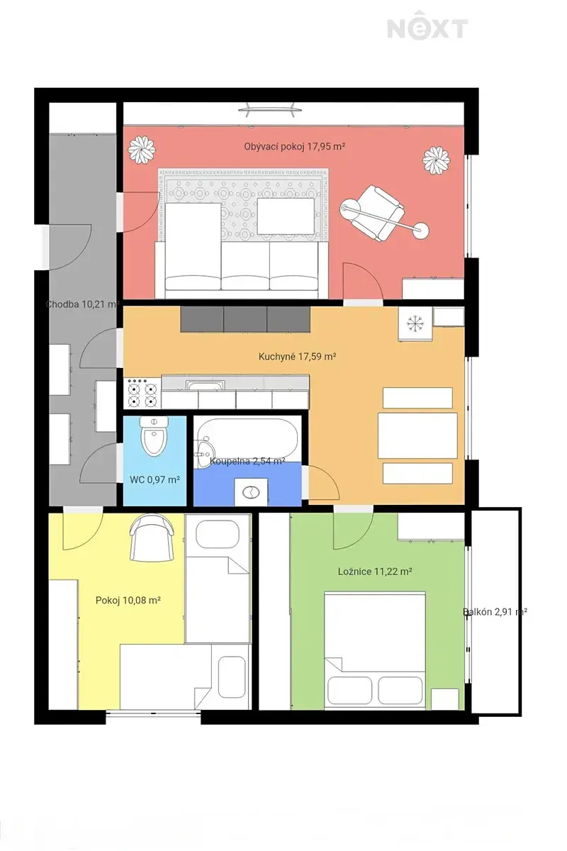Součástí je také balkon o výměře 2,91 m², který nabízí příjemné místo pro odpočinek. K dispozici je rovněž sklep poskytující dostatek úložného prostoru. Velkou výhodou je i samostatná spíž umístěná na patře, která zvyšuje komfort každodenního bydlení.