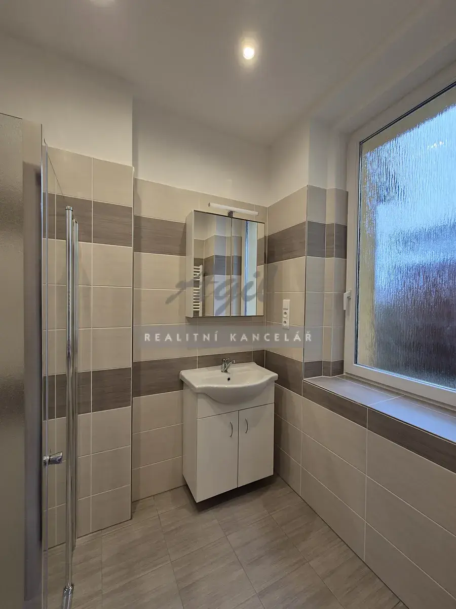 Koupelna – umyvadlo se spodní skříňkou, zrcadlová nástěnná skříňka s osvětlením, přípojka na pračku, otopný el.žebřík.