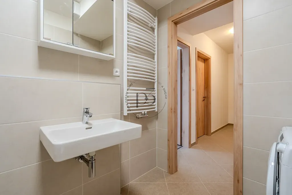 Byt nabízí obývací pokoj s přístupem na balkón a novou kuchyňskou linku včetně spotřebičů. Ložnice poskytuje dostatek soukromí a pohodlí. Koupelna je vybavena vanou a umyvadlem a WC. Součástí výbavy je i pračka. Chodba je prostorná pro umístění skříní pro dostatek úložného prostoru.