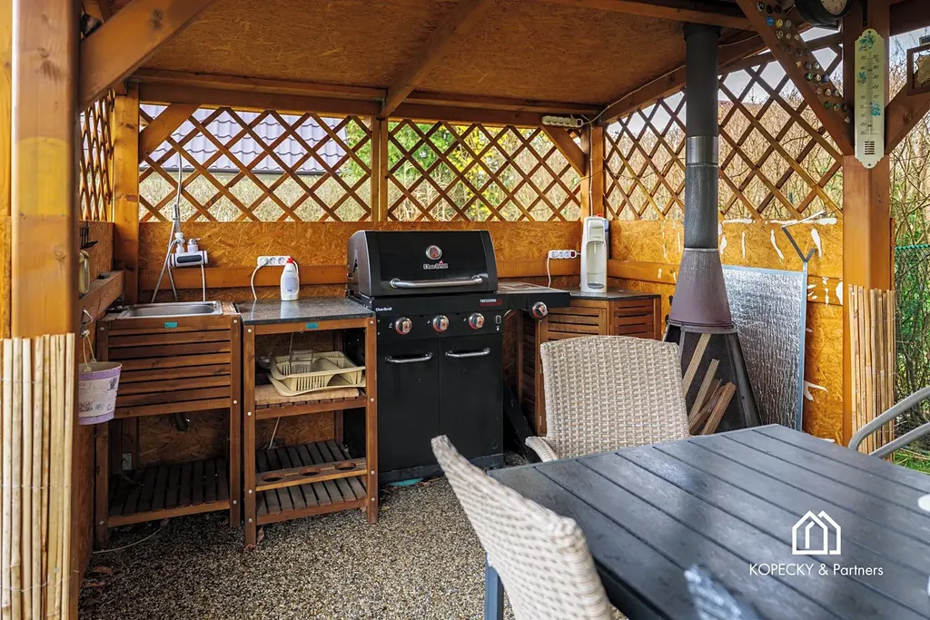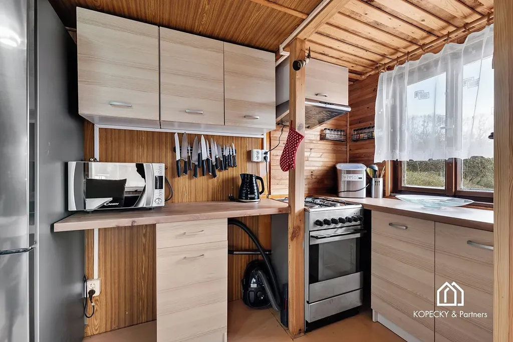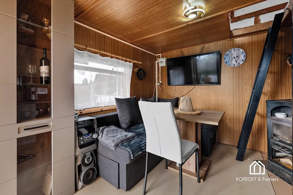 Do chaty je zavedena elektřina, nechybí zde kuchyňská linka ani krbová kamna, která dodávají interiéru příjemnou atmosféru a zároveň zajišťují vytápění v chladnějších dnech. Podkroví chaty slouží jako ložnice, takže prostor nabízí možnost pohodlného přespání. Vedle chaty se nachází samostatná místnost s chemickým záchodem, což zvyšuje komfort užívání celé nemovitosti. Na pozemek je zavedena sezónní pitná voda, která je praktickým benefitem pro zalévání, běžné využití zahrady i rekreační pobyt.