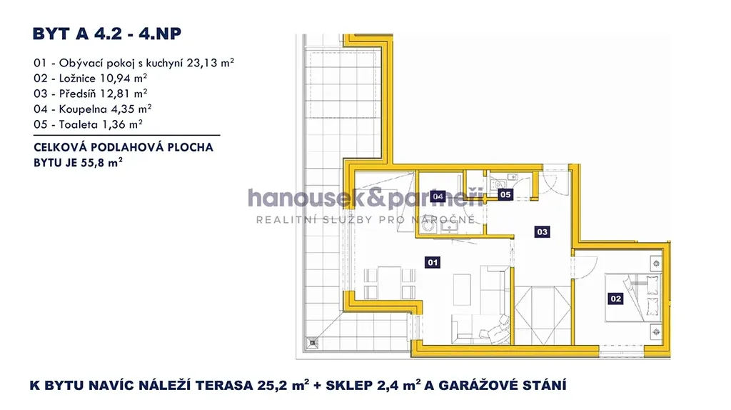 Nabízím vám byt s dispozicí 2+kk o velikosti 55,8 m2. V bytě je obývací pokoj s kuchyní, ložnice, předsíň, koupelna se sprchovým koutem a samostatné WC. Nachází se ve 4. patře domu A a navíc k němu patří terasa s výměrou 25,2 m2, sklep a garážové stání.
