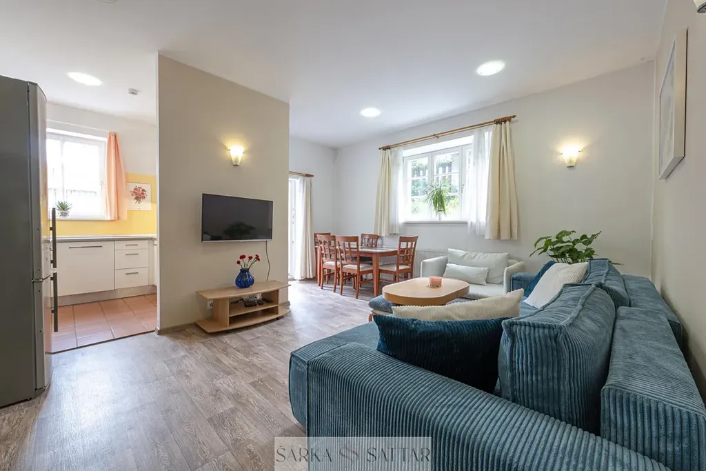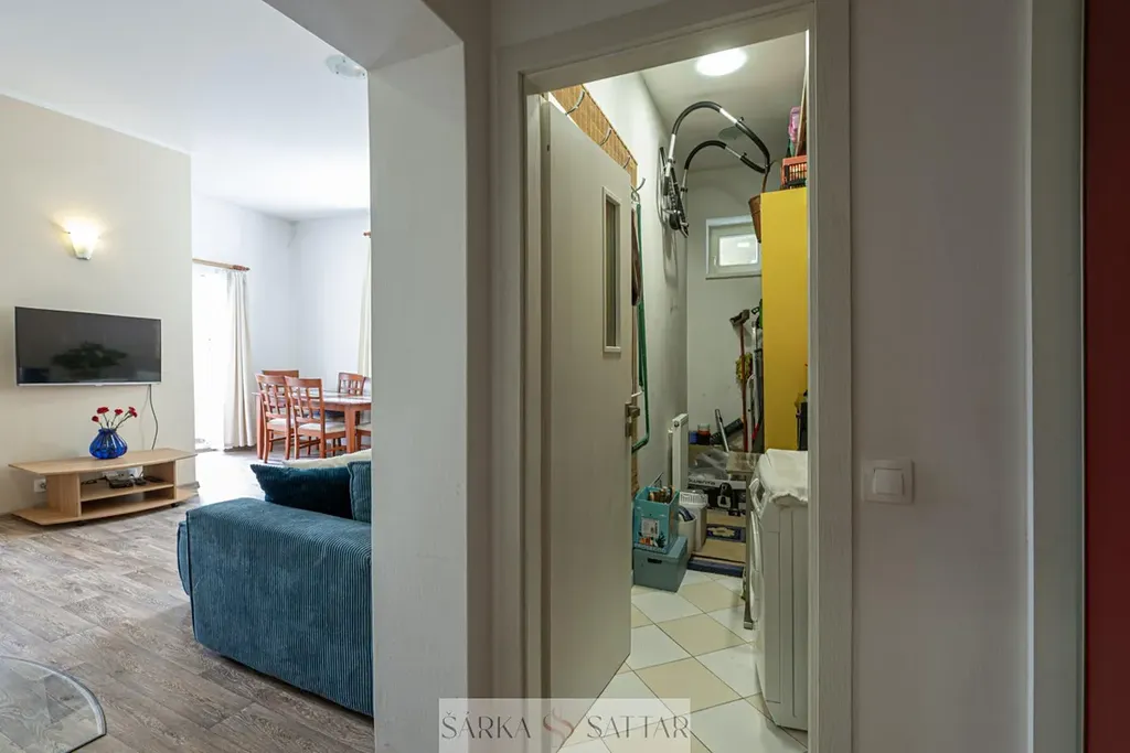 Je zde obývací pokoj s výstupem na zahradu a terasu, pracovní kout, dále plně vybavený kuchyňský kout s kvalitními spotřebiči (indukční deska, el. trouba, digestoř, lednice, mrazák, mikrovlnná trouba) obojí orientace - jih, také 2x ložnice, koupelna s sprchovým koutem, umyvadlem, uložnými prostory a toaletou, druhá samostatná toaleta s bidetovou sprškou a umyvadlem a kotlem Vaillant, komora na ukládání věcí s pračkou a přípravou na odvětrávání sušičky. Předsíň má vestavěnou skříň a úložný prostor na obuv.