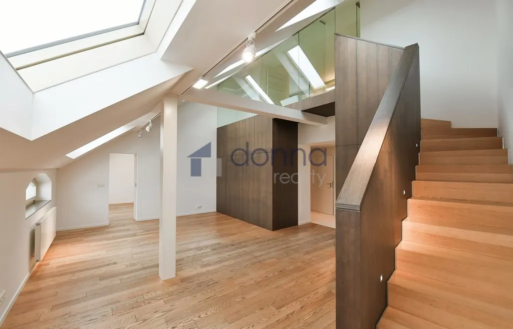 Nabízíme k pronájmu zrekonstruovaný, mezonetový byt 3+1, 130 m2 s terasou o velikosti 10 m2 směřující do klidného vnitrobloku ve 4. a 5. patře kompletně zrekonstruovaného bytového domu s výtahem, v lukrativní pražské čtvrti Praha 7 - Bubeneč. Dispozice bytu: vstupní hala se šatnou, obývací pokoj, plně vybavená kuchyň se spotřebiči (sklokeramická varná deska, elektrická trouba, myčka a lednice s mrazákem), ložnice s vestavěnou skříní, koupelna se sprchovým koutem a samostatné toaleta. Horní podlaží bytu: prosklená galerie s otevřenou koupelnou (vana, sprchový kout, toaleta a bidet) ložnice se vstupem na terasu, pracovna, šatna. Vysoké standardy zahrnují vysokou kvalitu materiálů a zpracování, dřevěné podlahy, dlažba. Byt je disponuje vestavěnými skříněmi, pračkou, zabudované stropní osvětlení, bezpečnostní dveře, klimatizace, videotelefon. Dům je situován v sousedství se rozlehlým parkem Stromovka a Letenských sadů. Výborná občanská vybavenost, v okolí se nachází nákupní centrum, obchody a množství restaurací i kaváren. V pěší dostupnosti se nachází tramvajová stanice Letenské náměstí. Volný k nastěhování 1. 5. 2026.