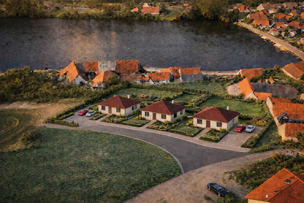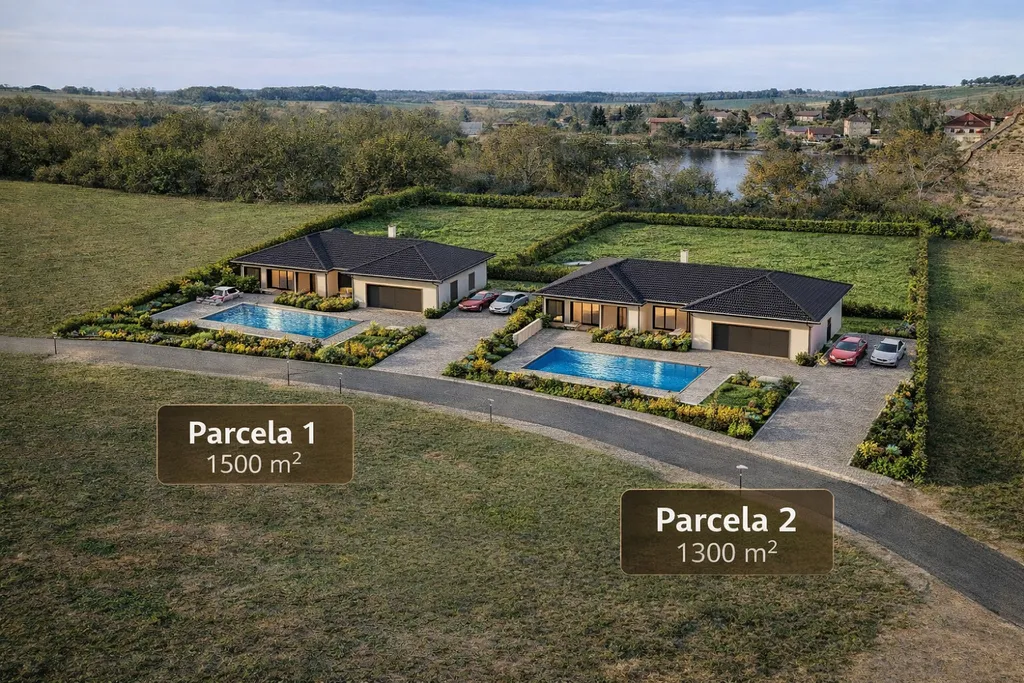 Součástí prezentace jsou také vizualizace možného budoucího využití, které slouží jako inspirace pro umístění staveb a celkové řešení pozemku.