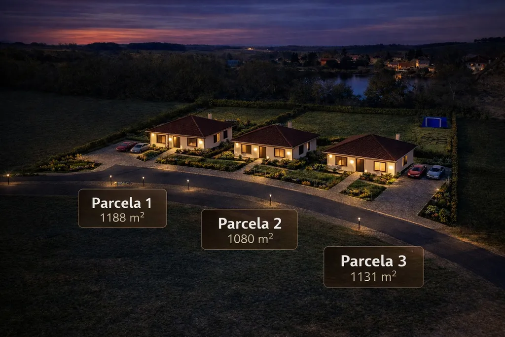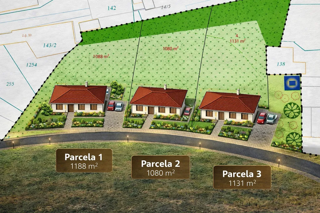 - nebo rozdělení až na 3 stavební pozemky o přibližných výměrách: