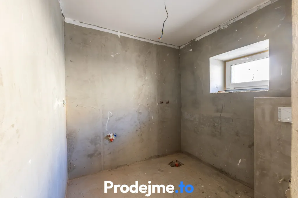 Místnosti čekají na podlahy a dokončení dveří včetně zárubní. Koupelna má hotové rozvody a připravený modul pro závěsnou toaletu – zbývá vybrat obklady a usadit sanitu. Stejně tak i v kuchyni jsou připravené veškeré rozvody, takže si ji můžete navrhnout a osadit podle vlastních představ.