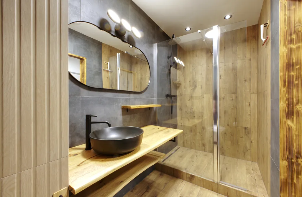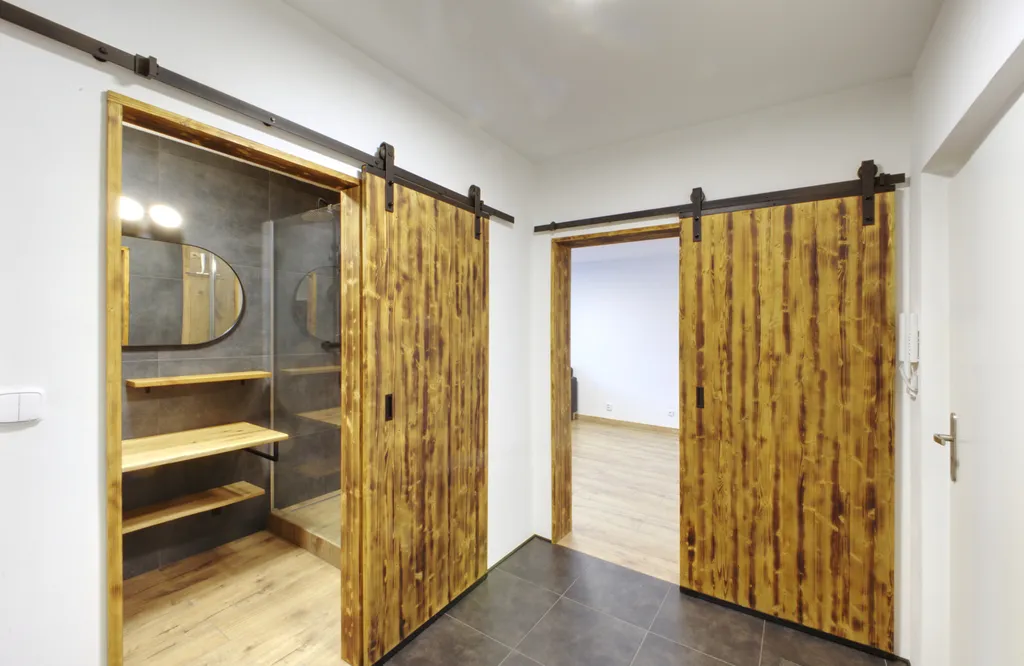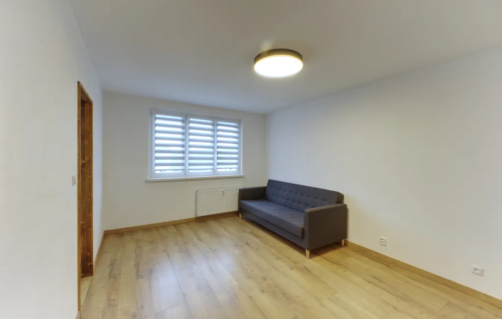 Kuchyňská linka je provedena v elegantní barvě granit a doplněna pracovní deskou v dekoru dřeva, která prostoru dodává příjemný a teplý charakter. Kuchyně je vybavena troubou značky Whirlpool, sklokeramickou varnou deskou a designovou digestoří. Na kuchyň navazuje obývací pokoj s plovoucí podlahou v dekoru dřeva, který je vybaven rozkládací pohovkou. Celý byt působí velmi moderně díky sladěným prvkům, jako jsou černé minimalistické lišty a stylové posuvné dveře z masivního dřeva s černým kováním. Velkou výhodou je jižní orientace oken, která zajišťuje dostatek denního světla po celý den, přičemž okna jsou opatřena plisé žaluziemi. Koupelna je řešena ve velmi moderním stylu a disponuje sprchovým koutem, závěsným WC, velkým zrcadlem a kvalitními obklady v kombinaci tmavých tónů a dekoru dřeva. Byt má také prostornou předsíň, která nabízí dostatek místa pro uložení věcí. Součástí bytu je pračka a rozkládací pohovka, které je možné odkoupit.