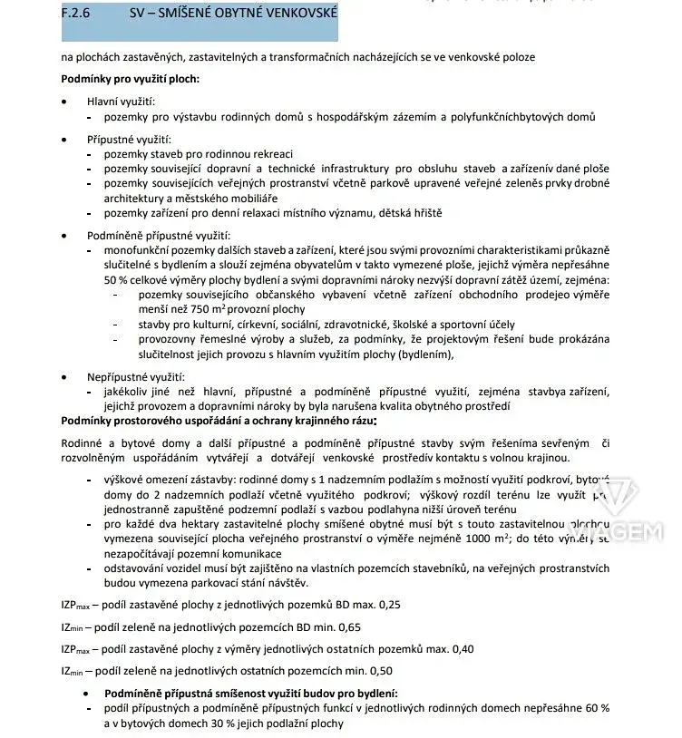 Dle územního plánu je pozemek veden v návrhové ploše smíšené obytné venkovské, určené pro výstavbu rodinných a bytových domů. Využití území je podmíněno zpracováním a realizací územní studie.