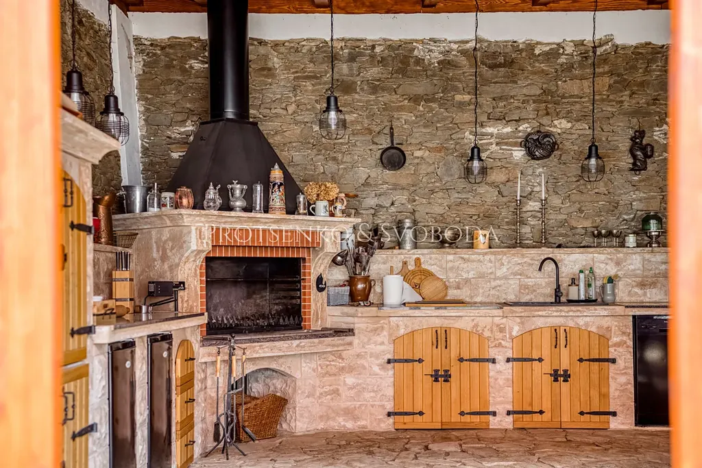 • zahradní kuchyně s odpadem, myčkou, teplou vodou, krbem a americkými kamny