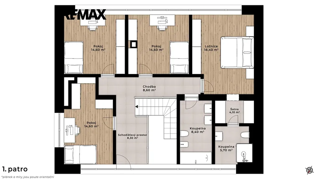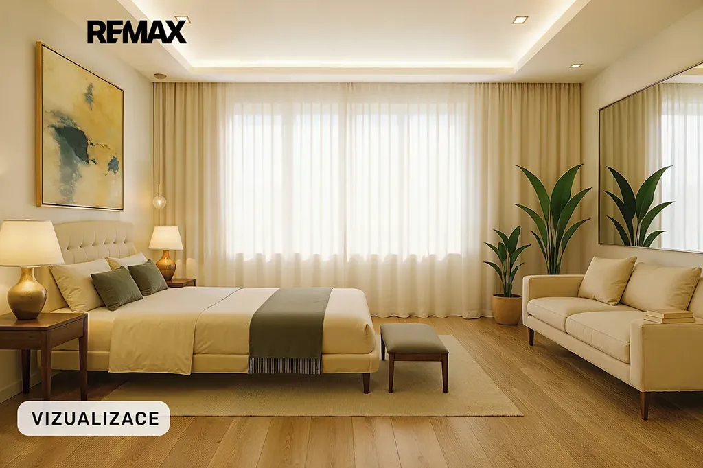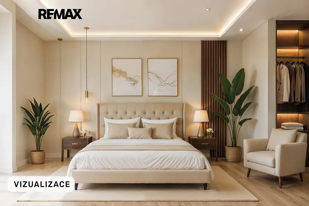- hlavní ložnice se šatnou a soukromou koupelnou (sprchový kout, WC)