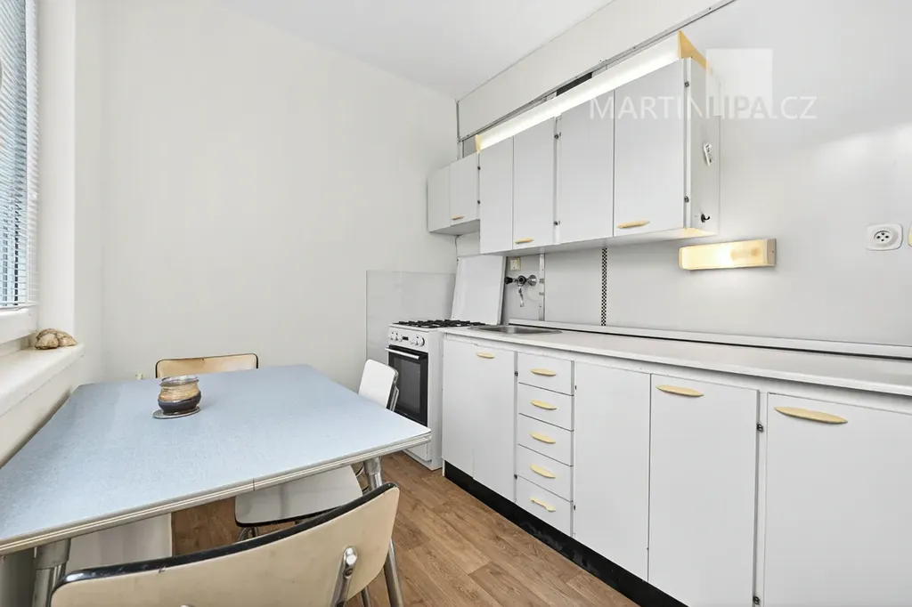 K dispozici jsou dva neprůchozí pokoje, každý o výměře 16,5 m², takže byt dobře poslouží páru i dvěma osobám, které chtějí zachovat dostatek soukromí. Kuchyň je samostatná a vybavena plynovým sporákem a lednicí. Koupelna je s vanou, toaleta oddělená. V předsíni jsou vestavěné skříně. Bytové jádro je původní umakartové, vybavení starší, ale funkční.
