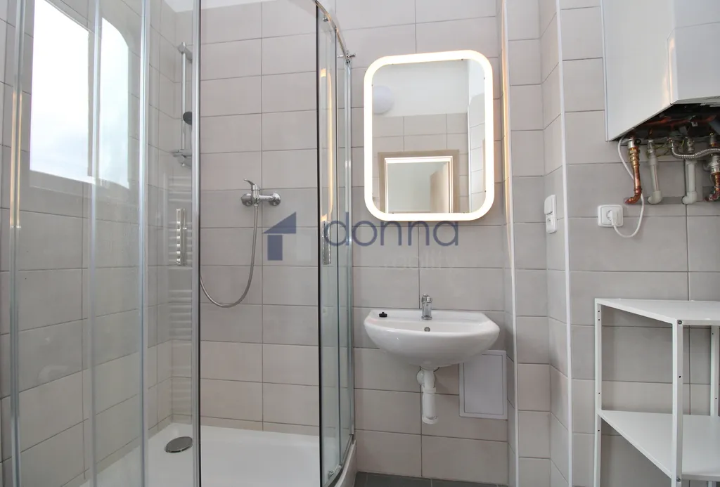 Koupelna se sprchovým koutem, toaleta oddělená dveřmi, ale jde se přes koupelnu.