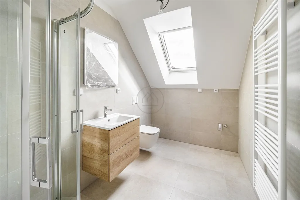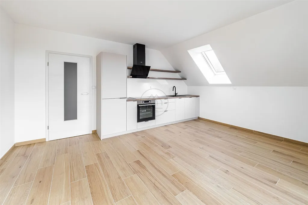 Podkrovní jednotka je promyšleně navržena a sestává ze zádveří, moderní koupelny s WC a prostorného obývacího pokoje s kuchyňským koutem. Hlavní dominantou je přímý vstup na balkon o rozloze 12,6 m², která nabízí dechberoucí panoramatický výhled na vodní hladinu. Dispozici doplňuje světlá ložnice a nadstandardně velká sklepní kóje v suterénu budovy.