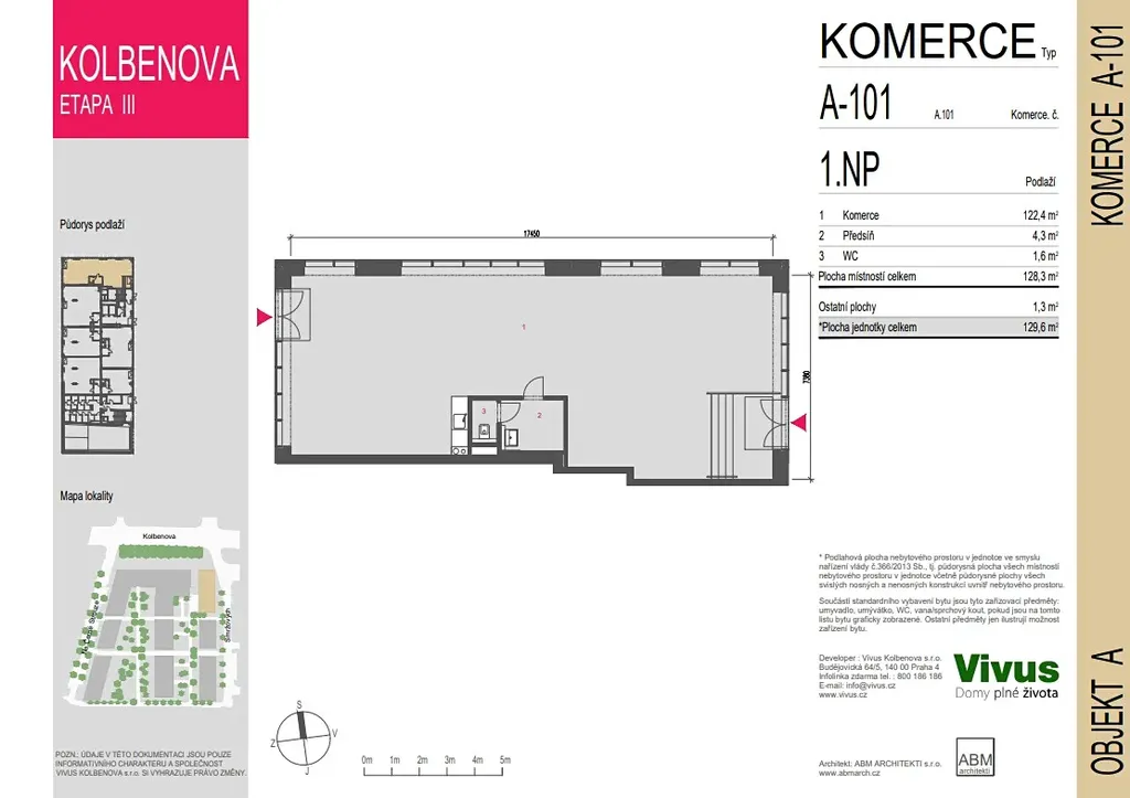 Nebytový prostor se nachází v právě budované třetí etapě projektu VIVUS KOLBENOVA. Prostor je součástí nově budovaného náměstíčka, kde již v etapě následující je počítáno kromě jiného také se supermarketem.