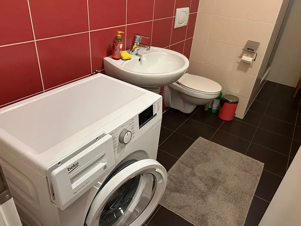 Koupelna se sprchovým koutem,umyvadlem a pračkou