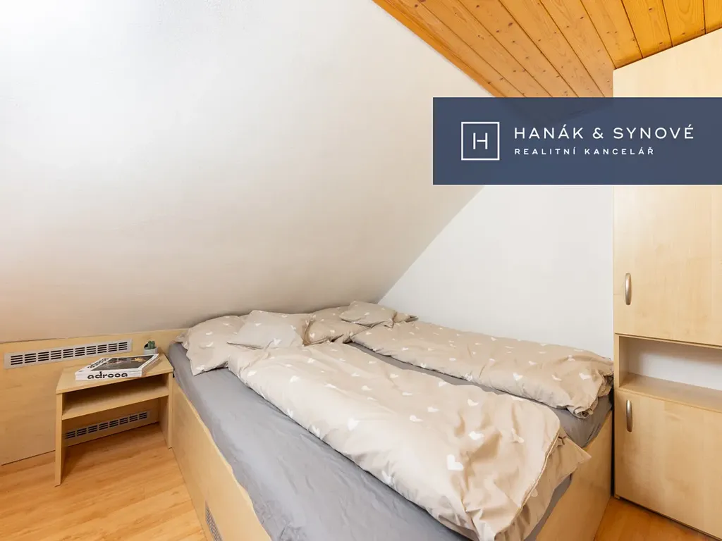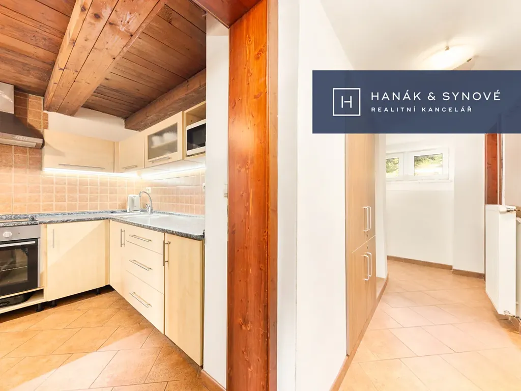 Přízemí chaty se otevírá vstupní chodbou, která nabízí praktický a přímý přístup do dřevníku i skladu, což zajišťuje maximální pohodlí při údržbě i ukládání věcí. Na chodbu plynule navazují vnitřní prostory domu, jimž dominuje hlavní obývací pokoj spojený s moderně vybavenou kuchyňskou linkou, která disponuje elektrickou troubou i elektrickým sporákem. Skutečným srdcem celého objektu jsou zdejší nádherná krbová kamna, která prostoru dodávají neopakovatelnou atmosféru a teplo. Kromě společenské části se v přízemí nachází také komfortní pokoj vybavený manželskou postelí, koupelna se sprchovým koutem, samostatná toaleta a nechybí ani praktická spíž pro uskladnění potravin. Podkroví nabízí dva oddělené pokoje přístupné z centrální chodby. První z nich je vybaven manželskou postelí, zatímco druhý disponuje čtyřmi lůžky a vstupem na balkon, který skýtá nádherný výhled do okolí.