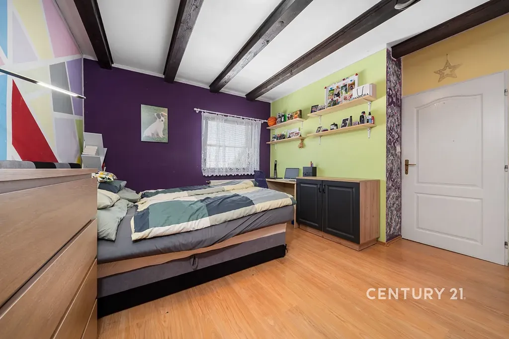 Interiér bytu působí velmi prostorně, čemuž dominuje nadstandardně velký obývací pokoj s krbem a kuchyňským koutem, který tvoří přirozené centrum domova. Dispozici dále doplňuje hlavní ložnice, dětský pokoj a další místnost, která v současnosti slouží jako praktická šatna. Byt je udržován ve velmi dobrém, byť původním stavu, což představuje ideální příležitost pro nového majitele, aby si prostor zrealizoval přesně podle svého vkusu a moderních standardů. Velkým bonusem je navíc 36 m² půdního prostoru náležícího k bytu, který lze stavebně propojit se stávající jednotkou a dále tak rozšířit obytnou plochu.