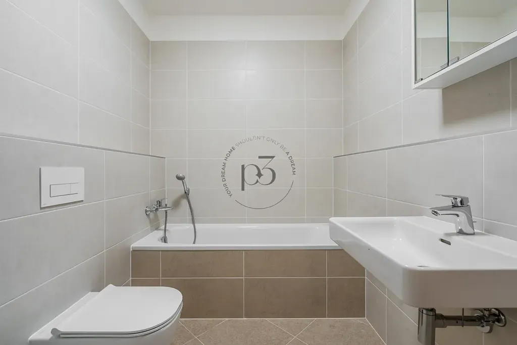 Nabízíme Vám k dlouhodobému pronájmu zcela nový byt o dispozici 2+kk nacházející se ve 1. patře novostavby s výtahem, o celkové výměře 43m2 a balkónem 7m2 v klidné a vyhledávané lokalitě Prahy 9 - Prosek. Byt je situován na západní stranu.