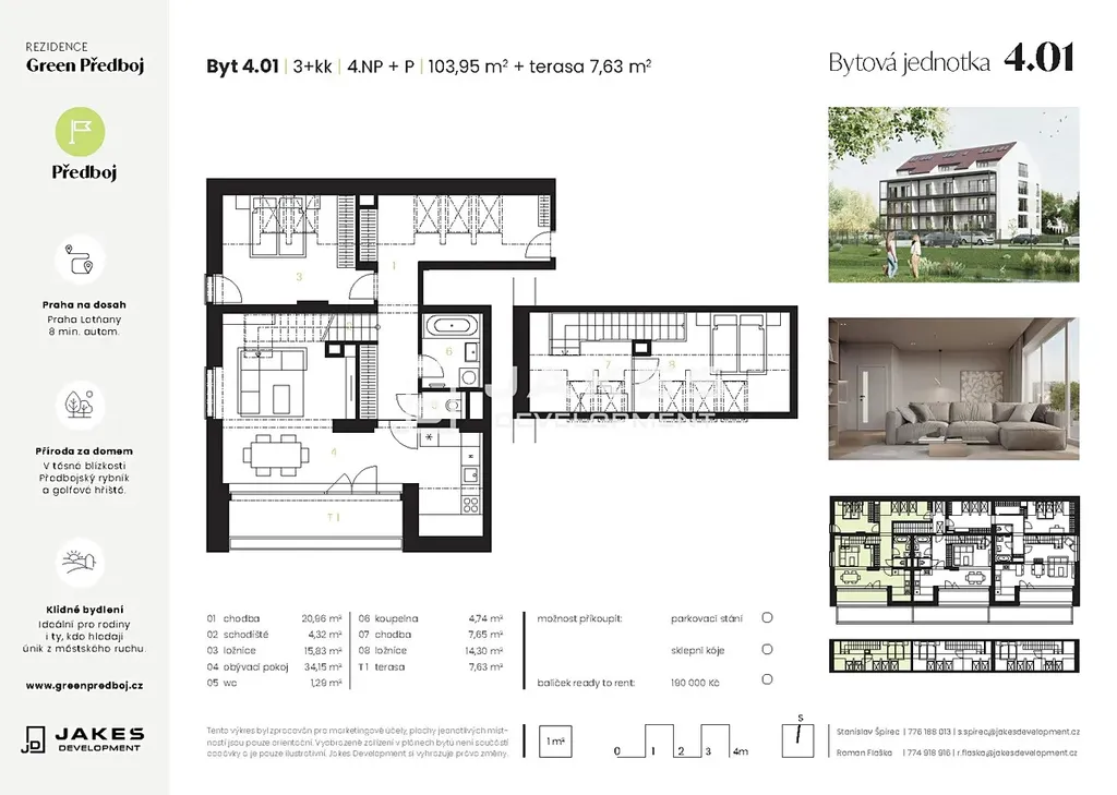 Nabízíme k prodeji byt 3+kk o velikosti 103,95 m² s terasou o velikosti 7,63 m2, nacházející se v 4. nadzemním podlaží a podkroví Rezidence Green Předboj. Byt bude dokončen ve vysokém standardu – kvalitní vinylové podlahy, moderní interiérové dveře a elegantní koupelna s keramickým obkladem a sanitou značky Laufen. Komfort zajišťuje podlahové vytápění, které přispívá k příjemné atmosféře i nízkým provozním nákladům.