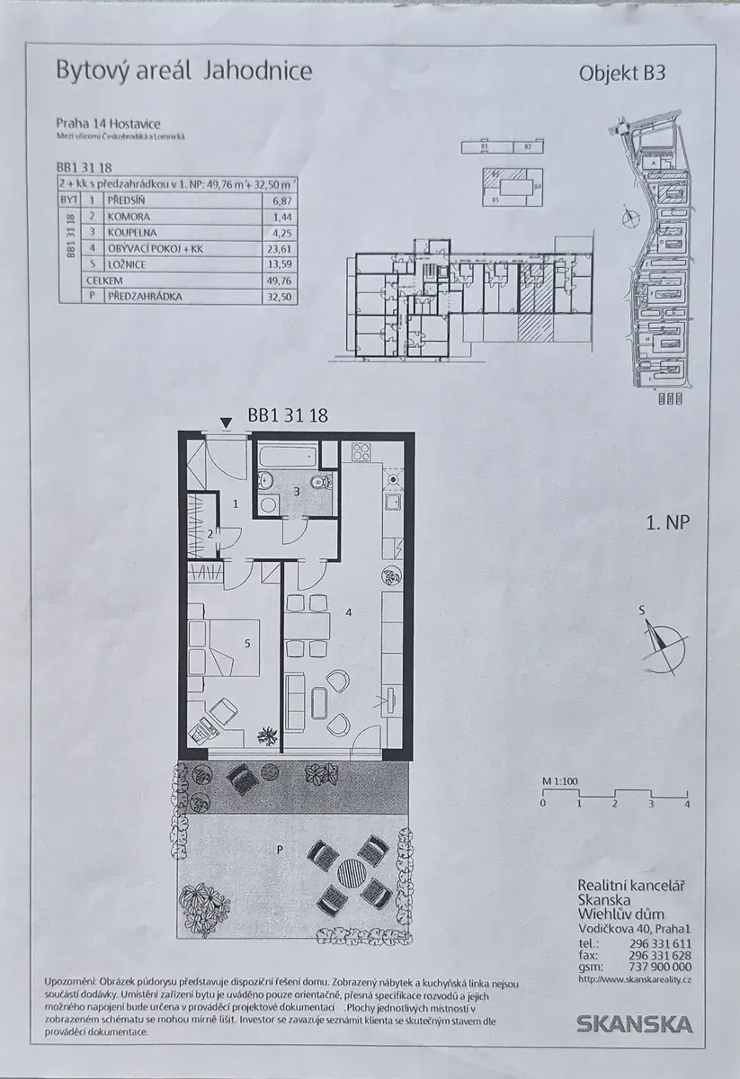 Byt s garážovým stáním, sklepem a zahrádkou, situovaný v udržovaném domě v žádané lokalitě pražských Hostavic. Byt sestává z předsíně, komory, koupelny s vanou a WC, obývacího pokoje s kuchyňským koutem a vstupem na zahradu a ložnice. Vybaven je kuchyňskou linkou s vestavěnou indukční varnou deskou, elektrickou troubou a myčkou. K bytu přísluší garážové stání a sklep. Klidné prostředí, dobré spojení ke stanici metra B Černý Most nebo Palmovka.