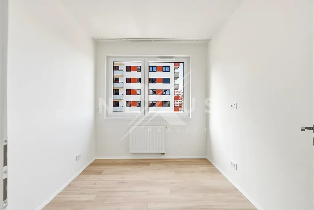 Dominantou bytu je obývací pokoj s kuchyňským koutem a vstupem na balkón, který nabízí příjemný, ničím nerušený výhled. Dispozice dále zahrnuje dva samostatné pokoje, koupelnu a oddělenou technickou místnost s přípravou pro pračku a sušičku.