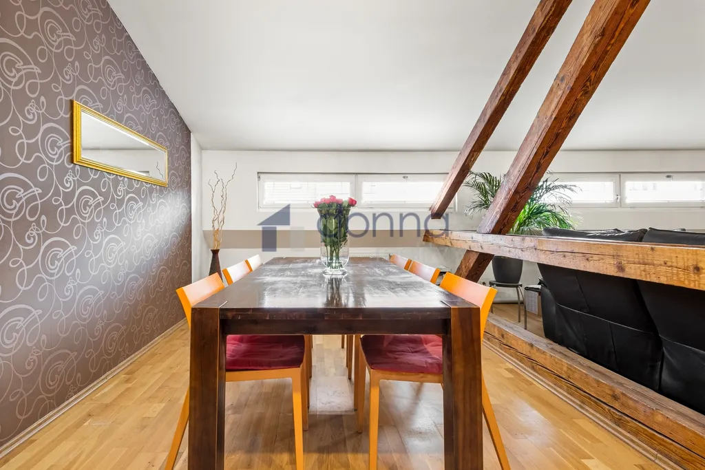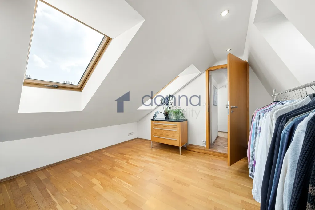 Tento dvouúrovňový byt je umístěný ve 4. podkrovním patře s mezonetem v cihlovém domě bez výtahu a nabízí zajímavé bydlení v klidném udržovaném domě pouze se šestnácti bytovými jednotkami.