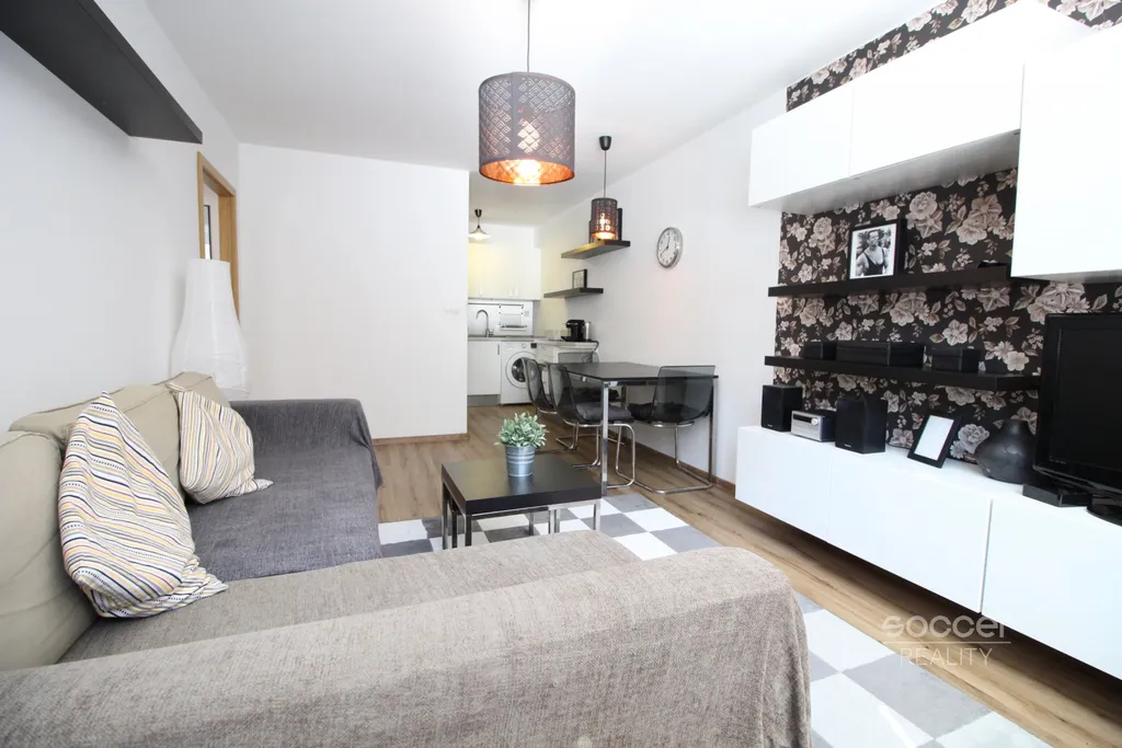 Byt je vybaven kuchyňskou linkou včetně všech spotřebičů, pračkou, stolem se židlemi, sedačkou, obývací stěnou a policemi. V ložnici je k dispozici skříň a v předsíni velká vestavná skříň, která nabízí dostatek úložného prostoru. Pokoje jsou průchozí. Koupelna je vybavena sprchovým koutem a WC. Podlahy tvoří dlažba a PVC. Topení je ústřední. Samozřejmostí je možnost připojení telefonu, kabelové TV a internetu od společností O2 a UPC.